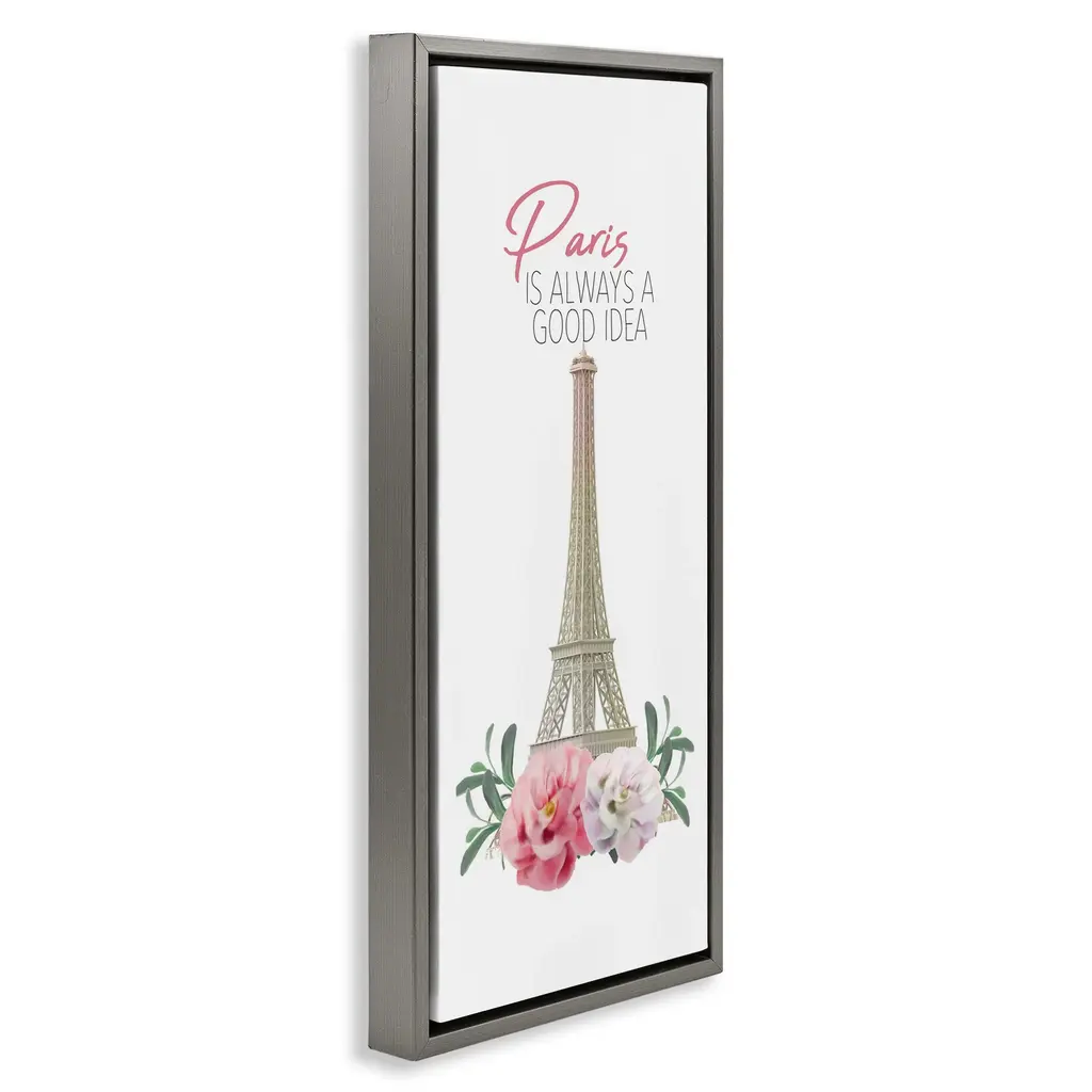 Elevate your home or office to the next level with Stupell Framed Floating Canvas Wall Art. Our premium hand-stretched canvas is mounted securely into a sturdy lightweight frame. The museum-style gap between the wrapped canvas and the box frame gives the illusion of floating artwork. Stupell Wall Art is made in the USA.Features: Dimensions: 11 x 1.7 x 25 Frame, 10 x 1.5 x 24 Canvas ArtFloating Frame Canvas Products are available in sizes 11"x25" and 14"x31". All Floating Frame Canvas Products have a 1.7" Depth.Wall Art is Ready to Hang with Hardware Free Hanging. No Installation required. For Easy Set Up Lean or Layer Artwork on Shelf or Against Wall. Artwork is Permently Fixed into the Frame.Our elevated 1.7" Thick Floating Frame is the perfect complement to our canvas style Wall Art. We use only the highest quality inks in house with industry leading printing solutions. Canvas is hand stretched over a durable wood foundation and then mounted securly into a Modern Box Frame. Made in the USA.Artwork Relates To: Glam, Travel, Paris, France, FloralDesign by Kim Allen