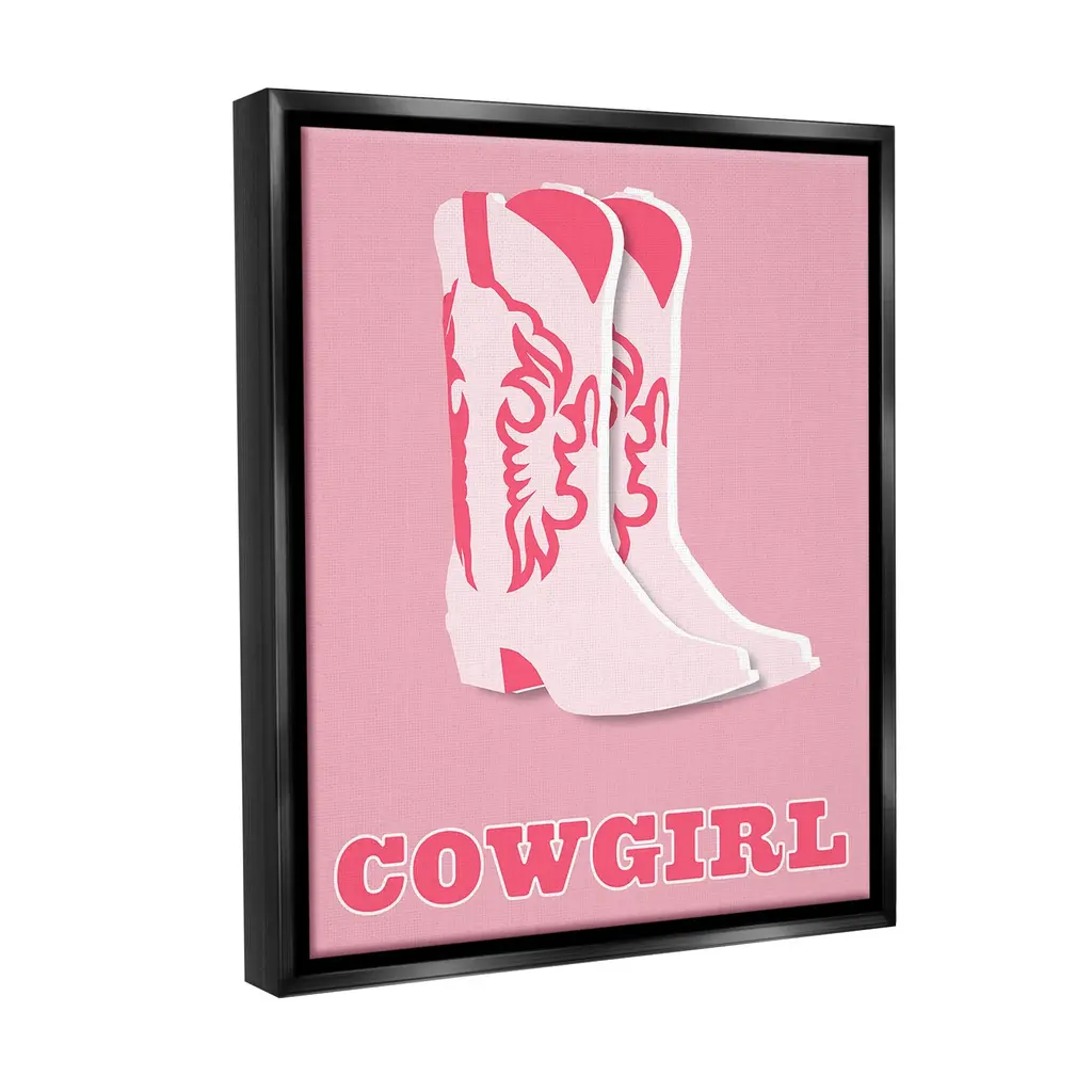 Elevate your home or office to the next level with Stupell Framed Floating Canvas Wall Art. Our premium hand-stretched canvas is mounted securely into a sturdy lightweight frame. The museum-style gap between the wrapped canvas and the box frame gives the illusion of floating artwork. Stupell Wall Art is made in the USA.Features: Dimensions: 17 x 1.7 x 21 Frame, 16 x 1.5 x 20 Canvas ArtFloating Frame Canvas Products are available in sizes 17"x21" and 25"x31". All Floating Frame Canvas Products have a 1.7" Depth.Wall Art is Ready to Hang with Hardware Free Hanging. No Installation required. For Easy Set Up Lean or Layer Artwork on Shelf or Against Wall. Artwork is Permently Fixed into the Frame.Our elevated 1.7" Thick Floating Frame is the perfect complement to our canvas style Wall Art. We use only the highest quality inks in house with industry leading printing solutions. Canvas is hand stretched over a durable wood foundation and then mounted securly into a Modern Box Frame. Made in the USA.Artwork Relates To: Equestrian, Rodeo, Country, Southwestern, Cowgirl, Cowboy Boot, Pink, PastelDesign by Corrine Rose Design