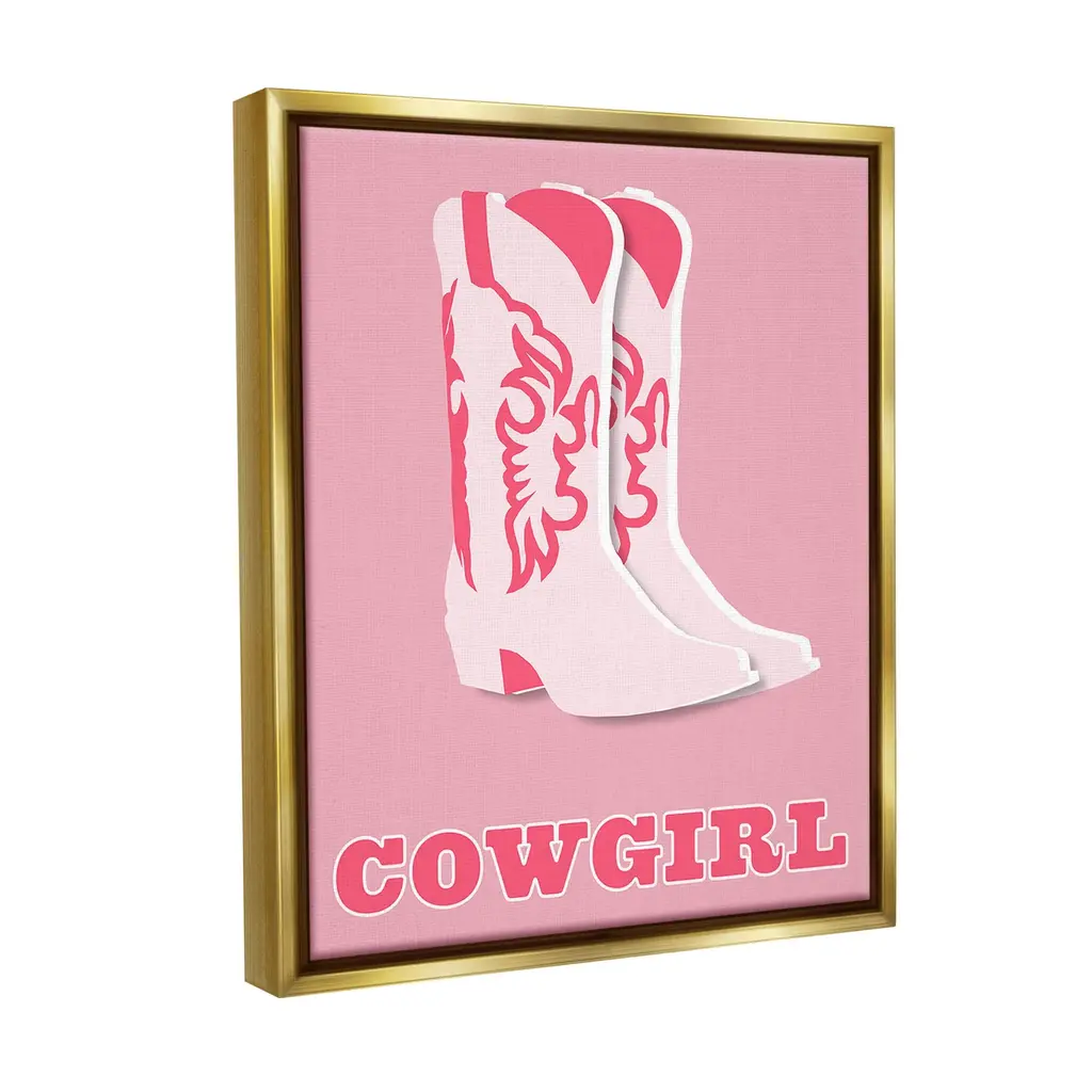 Elevate your home or office to the next level with Stupell Framed Floating Canvas Wall Art. Our premium hand-stretched canvas is mounted securely into a sturdy lightweight frame. The museum-style gap between the wrapped canvas and the box frame gives the illusion of floating artwork. Stupell Wall Art is made in the USA.Features: Dimensions: 17 x 1.7 x 21 Frame, 16 x 1.5 x 20 Canvas ArtFloating Frame Canvas Products are available in sizes 17"x21" and 25"x31". All Floating Frame Canvas Products have a 1.7" Depth.Wall Art is Ready to Hang with Hardware Free Hanging. No Installation required. For Easy Set Up Lean or Layer Artwork on Shelf or Against Wall. Artwork is Permently Fixed into the Frame.Our elevated 1.7" Thick Floating Frame is the perfect complement to our canvas style Wall Art. We use only the highest quality inks in house with industry leading printing solutions. Canvas is hand stretched over a durable wood foundation and then mounted securly into a Modern Box Frame. Made in the USA.Artwork Relates To: Equestrian, Rodeo, Country, Southwestern, Cowgirl, Cowboy Boot, Pink, PastelDesign by Corrine Rose Design