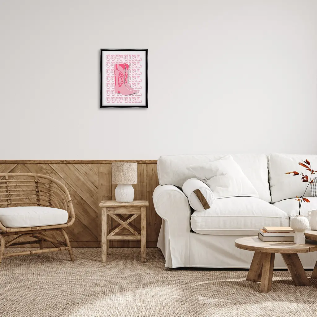 Elevate your home or office to the next level with Stupell Framed Floating Canvas Wall Art. Our premium hand-stretched canvas is mounted securely into a sturdy lightweight frame. The museum-style gap between the wrapped canvas and the box frame gives the illusion of floating artwork. Stupell Wall Art is made in the USA.Features: Dimensions: 17 x 1.7 x 21 Frame, 16 x 1.5 x 20 Canvas ArtFloating Frame Canvas Products are available in sizes 17"x21" and 25"x31". All Floating Frame Canvas Products have a 1.7" Depth.Wall Art is Ready to Hang with Hardware Free Hanging. No Installation required. For Easy Set Up Lean or Layer Artwork on Shelf or Against Wall. Artwork is Permently Fixed into the Frame.Our elevated 1.7" Thick Floating Frame is the perfect complement to our canvas style Wall Art. We use only the highest quality inks in house with industry leading printing solutions. Canvas is hand stretched over a durable wood foundation and then mounted securly into a Modern Box Frame. Made in the USA.Artwork Relates To: Equestrian, Rodeo, Country, Southwestern, Cowgirl, Cowboy Boot, Pink, Pastel, PatternDesign by Corrine Rose Design