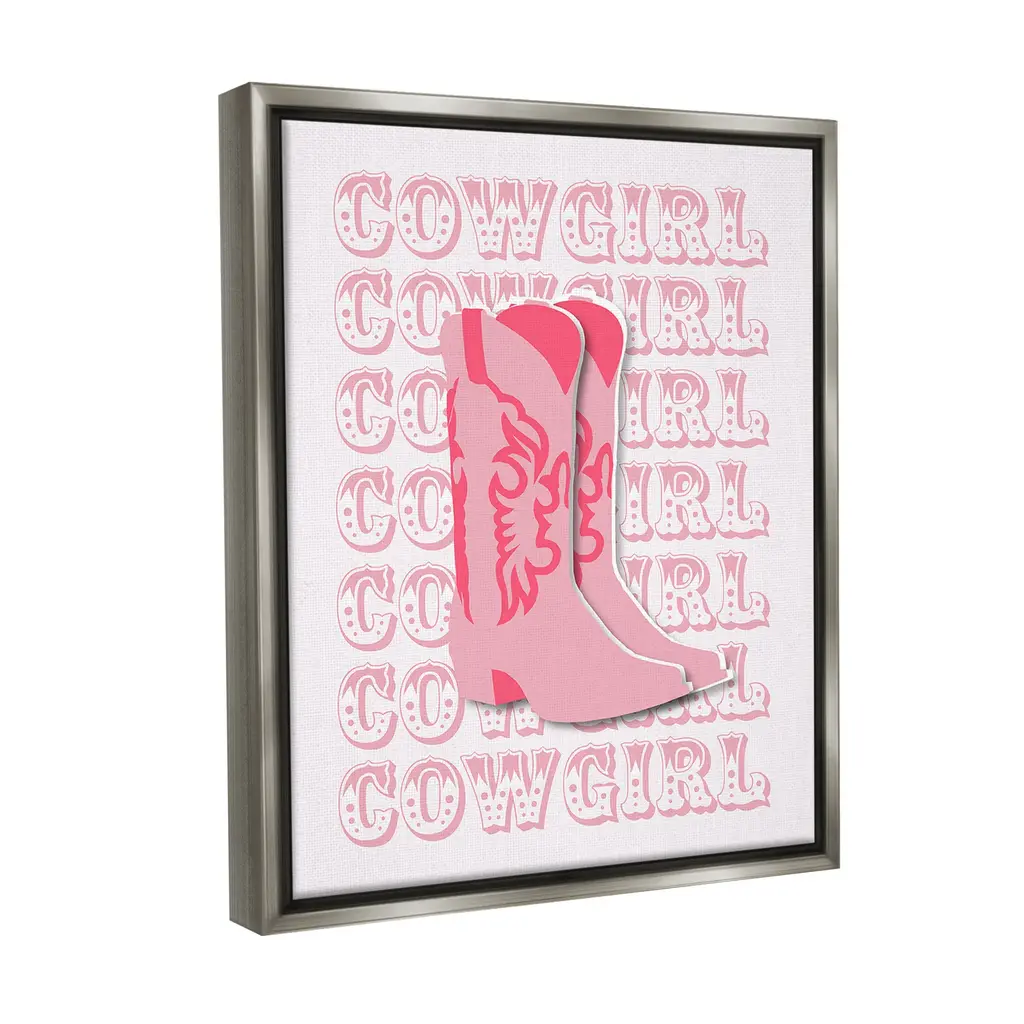 Elevate your home or office to the next level with Stupell Framed Floating Canvas Wall Art. Our premium hand-stretched canvas is mounted securely into a sturdy lightweight frame. The museum-style gap between the wrapped canvas and the box frame gives the illusion of floating artwork. Stupell Wall Art is made in the USA.Features: Dimensions: 17 x 1.7 x 21 Frame, 16 x 1.5 x 20 Canvas ArtFloating Frame Canvas Products are available in sizes 17"x21" and 25"x31". All Floating Frame Canvas Products have a 1.7" Depth.Wall Art is Ready to Hang with Hardware Free Hanging. No Installation required. For Easy Set Up Lean or Layer Artwork on Shelf or Against Wall. Artwork is Permently Fixed into the Frame.Our elevated 1.7" Thick Floating Frame is the perfect complement to our canvas style Wall Art. We use only the highest quality inks in house with industry leading printing solutions. Canvas is hand stretched over a durable wood foundation and then mounted securly into a Modern Box Frame. Made in the USA.Artwork Relates To: Equestrian, Rodeo, Country, Southwestern, Cowgirl, Cowboy Boot, Pink, Pastel, PatternDesign by Corrine Rose Design