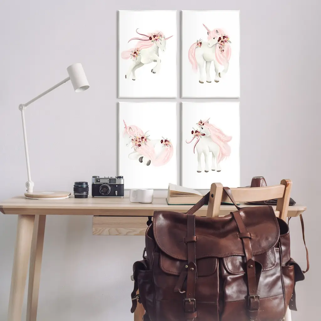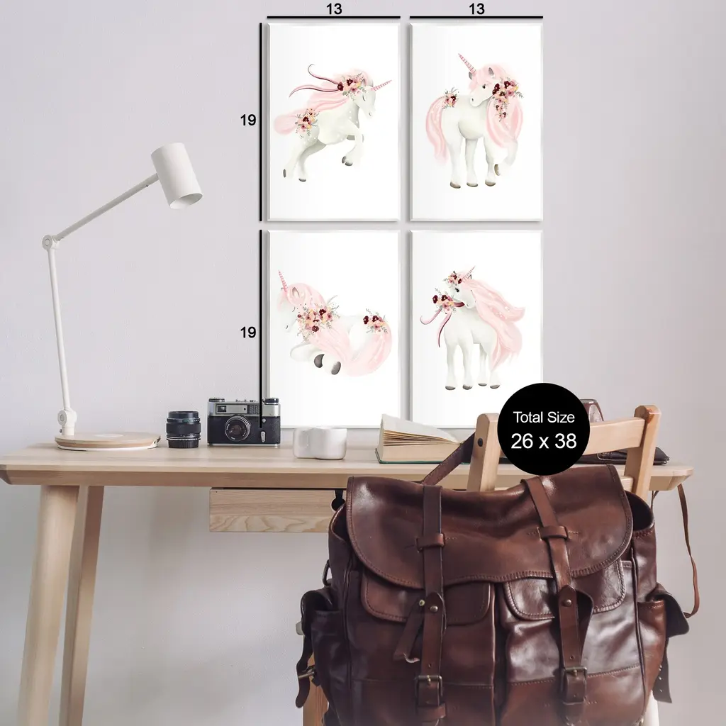Fill any space with Stupell Wall Art Sets. Our wall plaques start as high-quality lithograph prints mounted on durable 0.5-inch thick MDF wood. Each piece is hand finished and comes with a fresh layer of white foil on the sides to give it a crisp, clean look. Plaques arrive ready to hang without installation and come with removable plastic corners to keep them from damage in transit. Stupell Industries Wall Art is made in the USA.Features: Dimensions: 4 Piece Set, Each Panel is 10 x 0.5 x 15 InchesWall Plaque Set Sizes Include Standard: 4pc, Each is 10 x 0.5 x 15 Oversized: 4pc, Each is 13 x 0.5 x 19Wall Art is Ready to Hang with Hardware Free Hanging. No installation required. For Easy Set Up Lean or Layer Artwork on Shelf or Against Wall.All of our wall plaques start off as high quality lithograph prints that are then mounted on durable 0.5 inch thick MDF wood. Each piece is hand finished and comes with a fresh layer of foil on the sides to give it a crisp clean look. Made In USA.Artwork Relates To: Flower, Plant, Animal, Horse, Mammal, Floral, Cherry Blossom, Unicorn, FantasyDesign by Studio Q