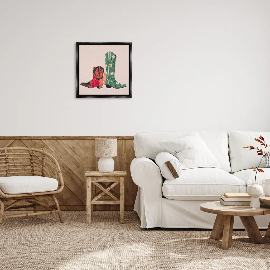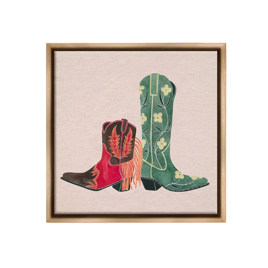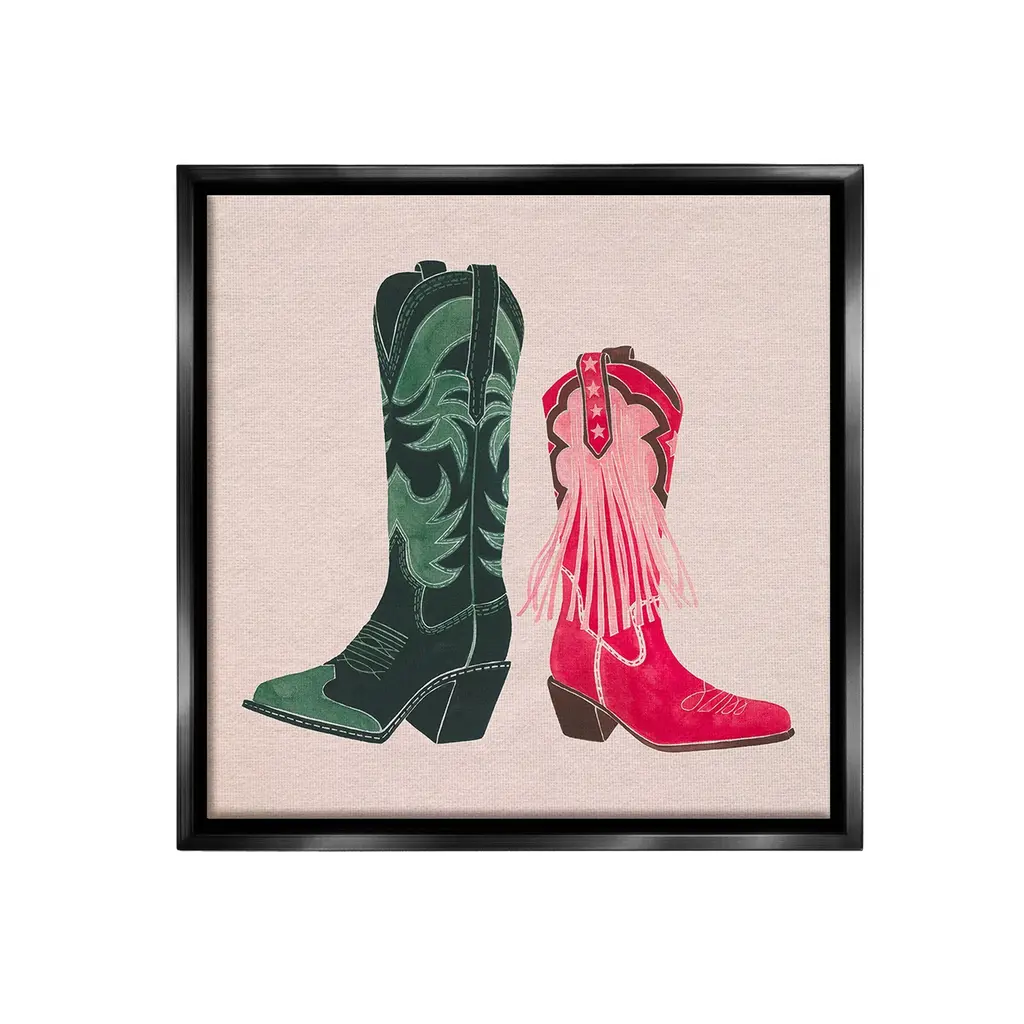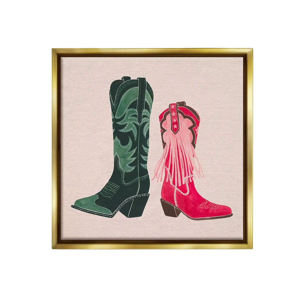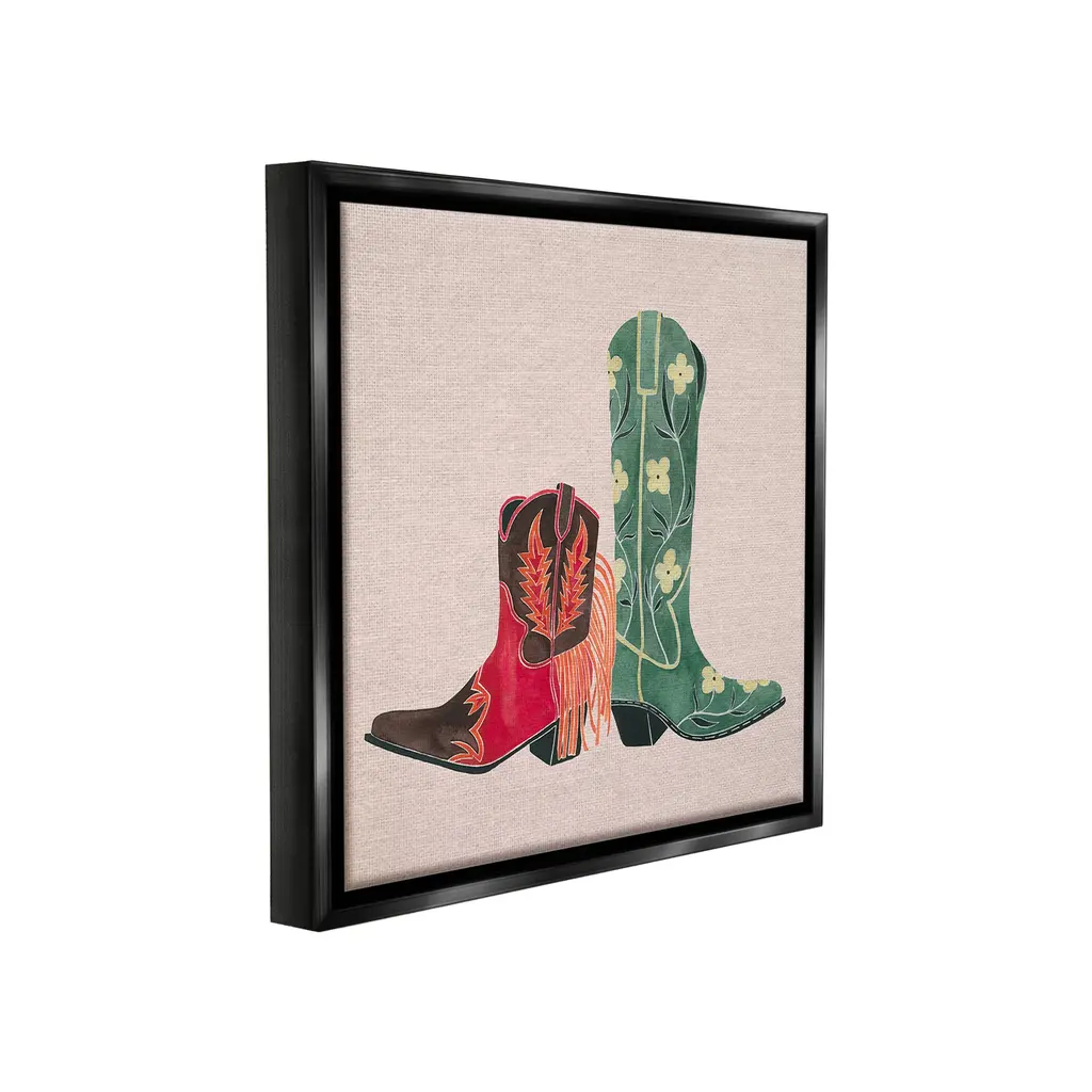 Elevate your home or office to the next level with Stupell Framed Floating Canvas Wall Art. Our premium hand-stretched canvas is mounted securely into a sturdy lightweight frame. The museum-style gap between the wrapped canvas and the box frame gives the illusion of floating artwork. Stupell Wall Art is made in the USA.Features: Dimensions: 18 x 1.7 x 18 Frame, 17 x 1.5 x 17 Canvas ArtFloating Frame Canvas Products are available in sizes 18"x18" and 25"x25". All Floating Frame Canvas Products have a 1.7" Depth.Wall Art is Ready to Hang with Hardware Free Hanging. No Installation required. For Easy Set Up Lean or Layer Artwork on Shelf or Against Wall. Artwork is Permently Fixed into the Frame.Our elevated 1.7" Thick Floating Frame is the perfect complement to our canvas style Wall Art. We use only the highest quality inks in house with industry leading printing solutions. Canvas is hand stretched over a durable wood foundation and then mounted securly into a Modern Box Frame. Made in the USA.Artwork Relates To: Equestrian, Rodeo, Country, Southwestern, Cowboy, Cowgirl, Cowboy BootDesign by Grace Popp
