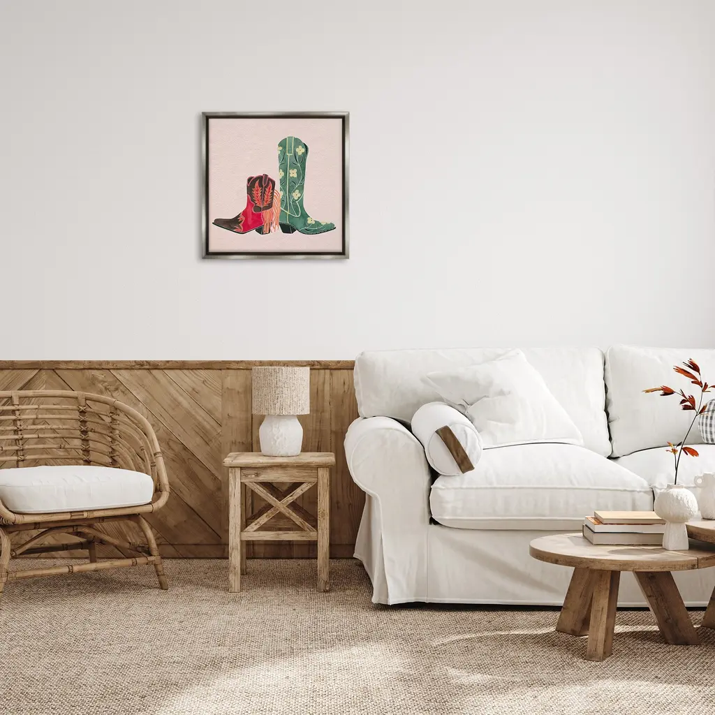 Elevate your home or office to the next level with Stupell Framed Floating Canvas Wall Art. Our premium hand-stretched canvas is mounted securely into a sturdy lightweight frame. The museum-style gap between the wrapped canvas and the box frame gives the illusion of floating artwork. Stupell Wall Art is made in the USA.Features: Dimensions: 18 x 1.7 x 18 Frame, 17 x 1.5 x 17 Canvas ArtFloating Frame Canvas Products are available in sizes 18"x18" and 25"x25". All Floating Frame Canvas Products have a 1.7" Depth.Wall Art is Ready to Hang with Hardware Free Hanging. No Installation required. For Easy Set Up Lean or Layer Artwork on Shelf or Against Wall. Artwork is Permently Fixed into the Frame.Our elevated 1.7" Thick Floating Frame is the perfect complement to our canvas style Wall Art. We use only the highest quality inks in house with industry leading printing solutions. Canvas is hand stretched over a durable wood foundation and then mounted securly into a Modern Box Frame. Made in the USA.Artwork Relates To: Equestrian, Rodeo, Country, Southwestern, Cowboy, Cowgirl, Cowboy BootDesign by Grace Popp