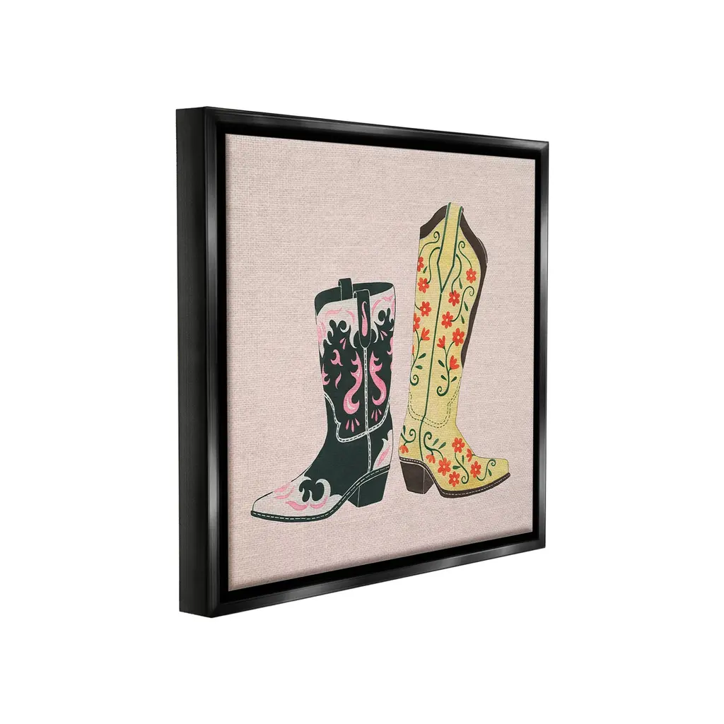Elevate your home or office to the next level with Stupell Framed Floating Canvas Wall Art. Our premium hand-stretched canvas is mounted securely into a sturdy lightweight frame. The museum-style gap between the wrapped canvas and the box frame gives the illusion of floating artwork. Stupell Wall Art is made in the USA.Features: Dimensions: 18 x 1.7 x 18 Frame, 17 x 1.5 x 17 Canvas ArtFloating Frame Canvas Products are available in sizes 18"x18" and 25"x25". All Floating Frame Canvas Products have a 1.7" Depth.Wall Art is Ready to Hang with Hardware Free Hanging. No Installation required. For Easy Set Up Lean or Layer Artwork on Shelf or Against Wall. Artwork is Permently Fixed into the Frame.Our elevated 1.7" Thick Floating Frame is the perfect complement to our canvas style Wall Art. We use only the highest quality inks in house with industry leading printing solutions. Canvas is hand stretched over a durable wood foundation and then mounted securly into a Modern Box Frame. Made in the USA.Artwork Relates To: Equestrian, Rodeo, Country, Southwestern, Cowboy, Cowgirl, Cowboy BootDesign by Grace Popp