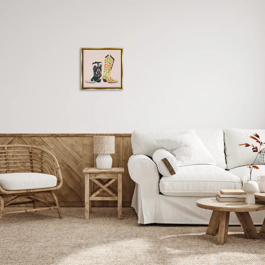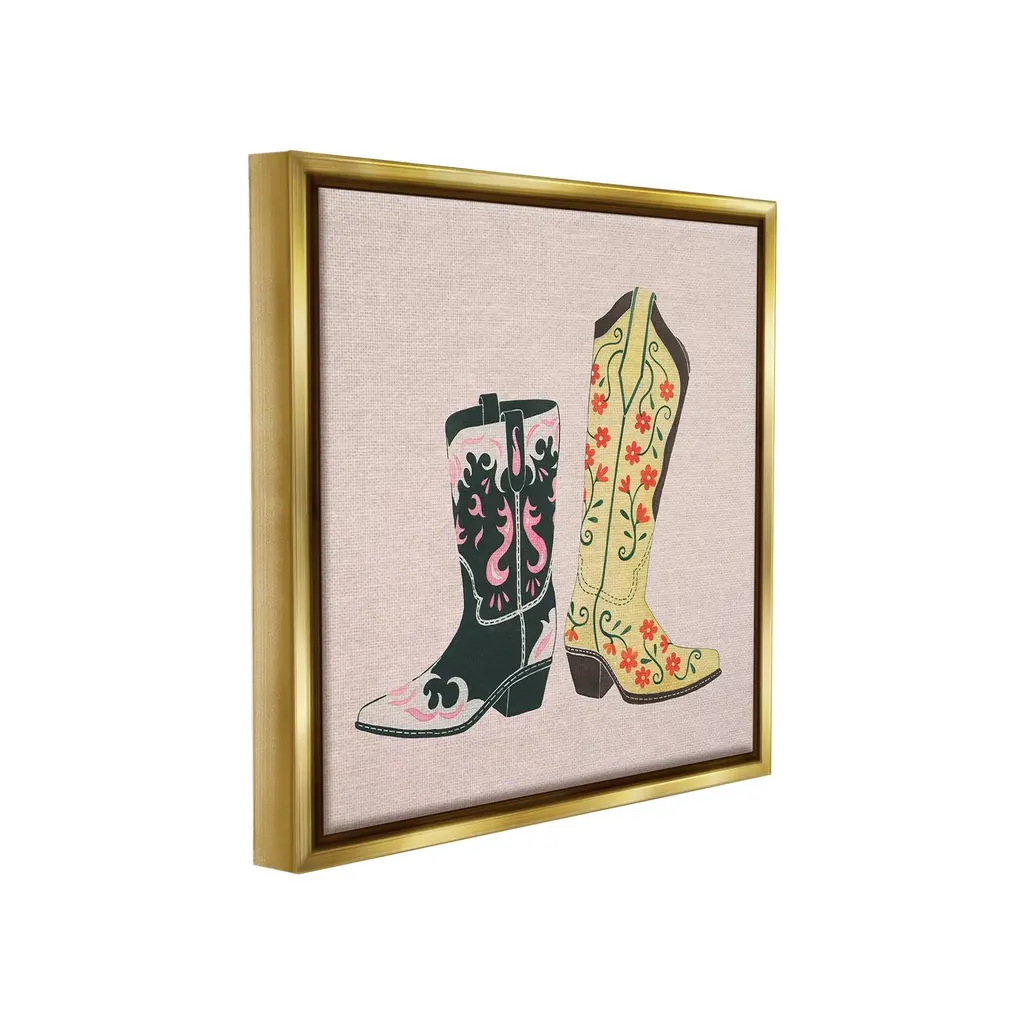 Elevate your home or office to the next level with Stupell Framed Floating Canvas Wall Art. Our premium hand-stretched canvas is mounted securely into a sturdy lightweight frame. The museum-style gap between the wrapped canvas and the box frame gives the illusion of floating artwork. Stupell Wall Art is made in the USA.Features: Dimensions: 18 x 1.7 x 18 Frame, 17 x 1.5 x 17 Canvas ArtFloating Frame Canvas Products are available in sizes 18"x18" and 25"x25". All Floating Frame Canvas Products have a 1.7" Depth.Wall Art is Ready to Hang with Hardware Free Hanging. No Installation required. For Easy Set Up Lean or Layer Artwork on Shelf or Against Wall. Artwork is Permently Fixed into the Frame.Our elevated 1.7" Thick Floating Frame is the perfect complement to our canvas style Wall Art. We use only the highest quality inks in house with industry leading printing solutions. Canvas is hand stretched over a durable wood foundation and then mounted securly into a Modern Box Frame. Made in the USA.Artwork Relates To: Equestrian, Rodeo, Country, Southwestern, Cowboy, Cowgirl, Cowboy BootDesign by Grace Popp
