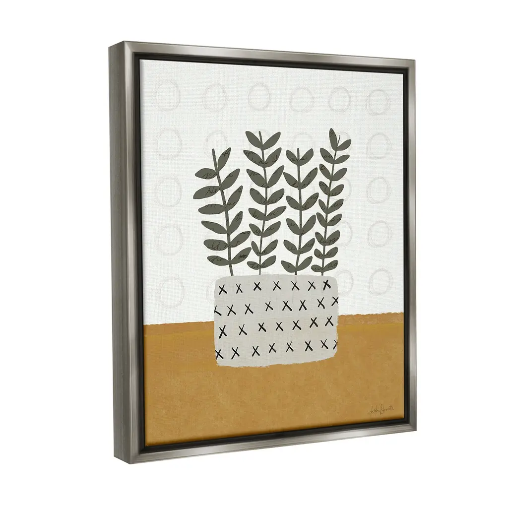 Elevate your home or office to the next level with Stupell Framed Floating Canvas Wall Art. Our premium hand-stretched canvas is mounted securely into a sturdy lightweight frame. The museum-style gap between the wrapped canvas and the box frame gives the illusion of floating artwork. Stupell Wall Art is made in the USA.Features: Dimensions: 17 x 1.7 x 21 Frame, 16 x 1.5 x 20 Canvas ArtFloating Frame Canvas Products are available in sizes 17"x21" and 25"x31". All Floating Frame Canvas Products have a 1.7" Depth.Wall Art is Ready to Hang with Hardware Free Hanging. No Installation required. For Easy Set Up Lean or Layer Artwork on Shelf or Against Wall. Artwork is Permently Fixed into the Frame.Our elevated 1.7" Thick Floating Frame is the perfect complement to our canvas style Wall Art. We use only the highest quality inks in house with industry leading printing solutions. Canvas is hand stretched over a durable wood foundation and then mounted securly into a Modern Box Frame. Made in the USA.Artwork Relates To: Plant, Pottery, Vase, Botanical, Plant, Leaf, Cottage, Modern, Abstract, PatternDesign by Katie Doucette