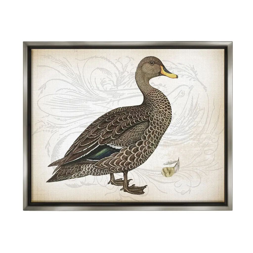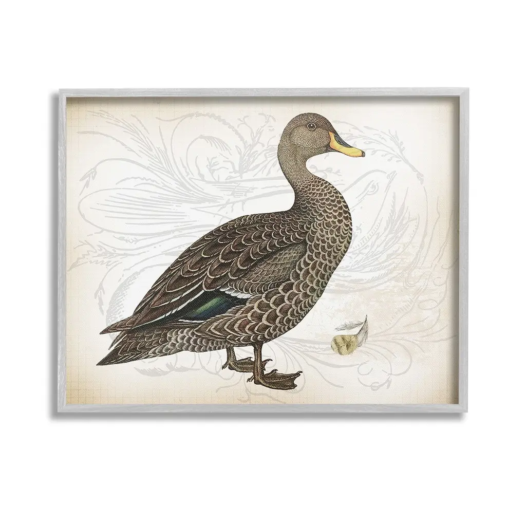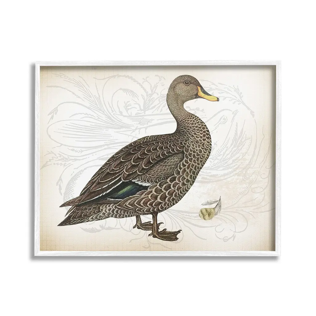 Add dimension to any room with our textured Framed Giclee Artwork. Our framed artwork is securely mounted into a 1.5-inch thick wood grain frame and ready to hang. Frames are available in three alluring styles: black, gray farmhouse and white. In addition, you should check out our oversized options if you want a statement piece. Stupell Wall Art is made in the USA.Features: Dimensions: 14 x 1.5 x 11 FramedFramed Giclee Products are available in the sizes 14"x11", 20"x16" or 30"x24". All Framed Giclee Products have a 1.5" Depth. Wall Art is Ready to Hang with Hardware Free Hanging. No installation required. For Easy Set Up Lean or Layer Artwork on Shelf or Against Wall.Our giclée prints are carefully mounted on a durable MDF backing, and then perfectly finished in a 1.5 inch thick woodgrain frame. Mounted frame colors include black, gray farmhouse and white. Made In USA.Artwork Relates To: Animal, Bird, Waterfowl, Duck, Goose, Vintage, Pattern, Floral, FlowerDesign by Lula Bijoux & co.