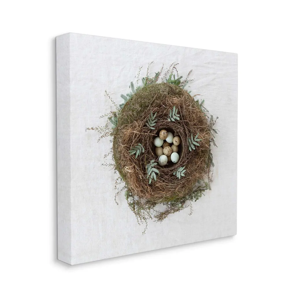 Proudly made in the USA, Our stretched canvas is created with the highest standards. We use only the highest quality inks and canvas on our in house Mimaki printers, and then hand cut and stretch each piece over a 1.5 inch thick wooden frame for hanging. The art comes ready to hang with no installation required.Features: Wall Art is Ready to Hang - No Installation or Hardware Needed. For Easy Set Up Lean or Layer Artwork on Shelf or Against Wall.Our stretched canvas is created with the highest standards. We use only the highest quality inks and canvas on our in house Mimaki printers, and then hand cut and stretch each piece over a 1.5 inch thick wooden frame for hanging. Made In USA.Artwork Relates To: Nest; Bird Nest; EggsDesign by Tania Soderman
