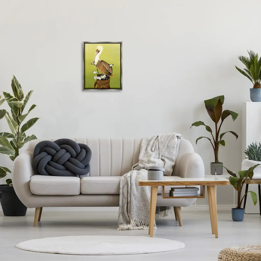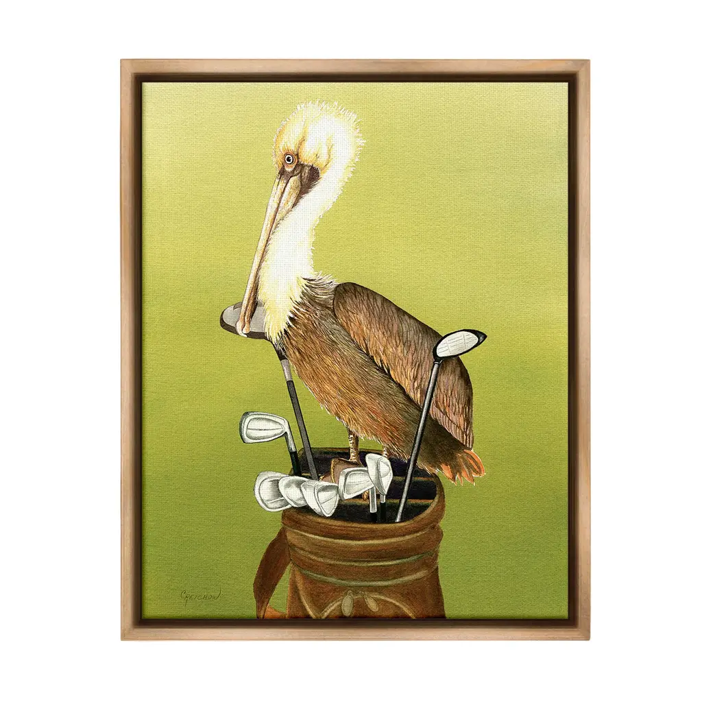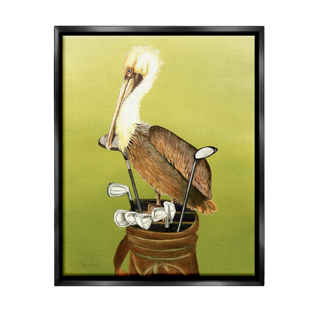 Elevate your home or office to the next level with Stupell Framed Floating Canvas Wall Art. Our premium hand-stretched canvas is mounted securely into a sturdy lightweight frame. The museum-style gap between the wrapped canvas and the box frame gives the illusion of floating artwork. Stupell Wall Art is made in the USA.Features: Dimensions: 17 x 1.7 x 21 Frame, 16 x 1.5 x 20 Canvas ArtFloating Frame Canvas Products are available in sizes 17"x21" and 25"x31". All Floating Frame Canvas Products have a 1.7" Depth.Wall Art is Ready to Hang with Hardware Free Hanging. No Installation required. For Easy Set Up Lean or Layer Artwork on Shelf or Against Wall. Artwork is Permently Fixed into the Frame.Our elevated 1.7" Thick Floating Frame is the perfect complement to our canvas style Wall Art. We use only the highest quality inks in house with industry leading printing solutions. Canvas is hand stretched over a durable wood foundation and then mounted securly into a Modern Box Frame. Made in the USA.Artwork Relates To: Animal, Bird, Waterfowl, Pelican, Golf, Golf Club, SportDesign by Christine Reichow