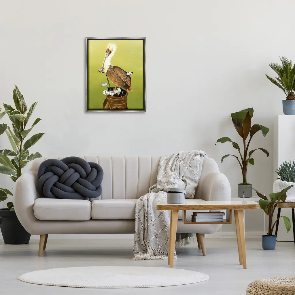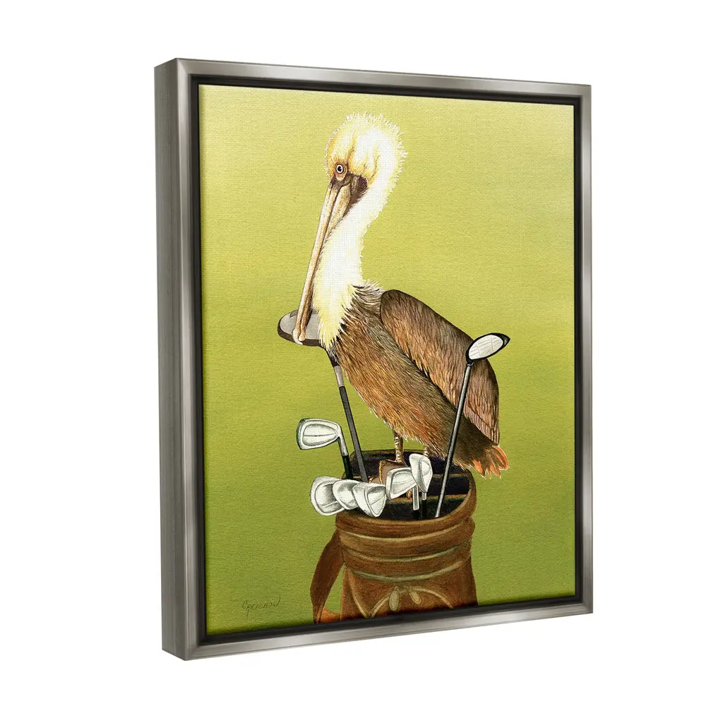 Elevate your home or office to the next level with Stupell Framed Floating Canvas Wall Art. Our premium hand-stretched canvas is mounted securely into a sturdy lightweight frame. The museum-style gap between the wrapped canvas and the box frame gives the illusion of floating artwork. Stupell Wall Art is made in the USA.Features: Dimensions: 17 x 1.7 x 21 Frame, 16 x 1.5 x 20 Canvas ArtFloating Frame Canvas Products are available in sizes 17"x21" and 25"x31". All Floating Frame Canvas Products have a 1.7" Depth.Wall Art is Ready to Hang with Hardware Free Hanging. No Installation required. For Easy Set Up Lean or Layer Artwork on Shelf or Against Wall. Artwork is Permently Fixed into the Frame.Our elevated 1.7" Thick Floating Frame is the perfect complement to our canvas style Wall Art. We use only the highest quality inks in house with industry leading printing solutions. Canvas is hand stretched over a durable wood foundation and then mounted securly into a Modern Box Frame. Made in the USA.Artwork Relates To: Animal, Bird, Waterfowl, Pelican, Golf, Golf Club, SportDesign by Christine Reichow