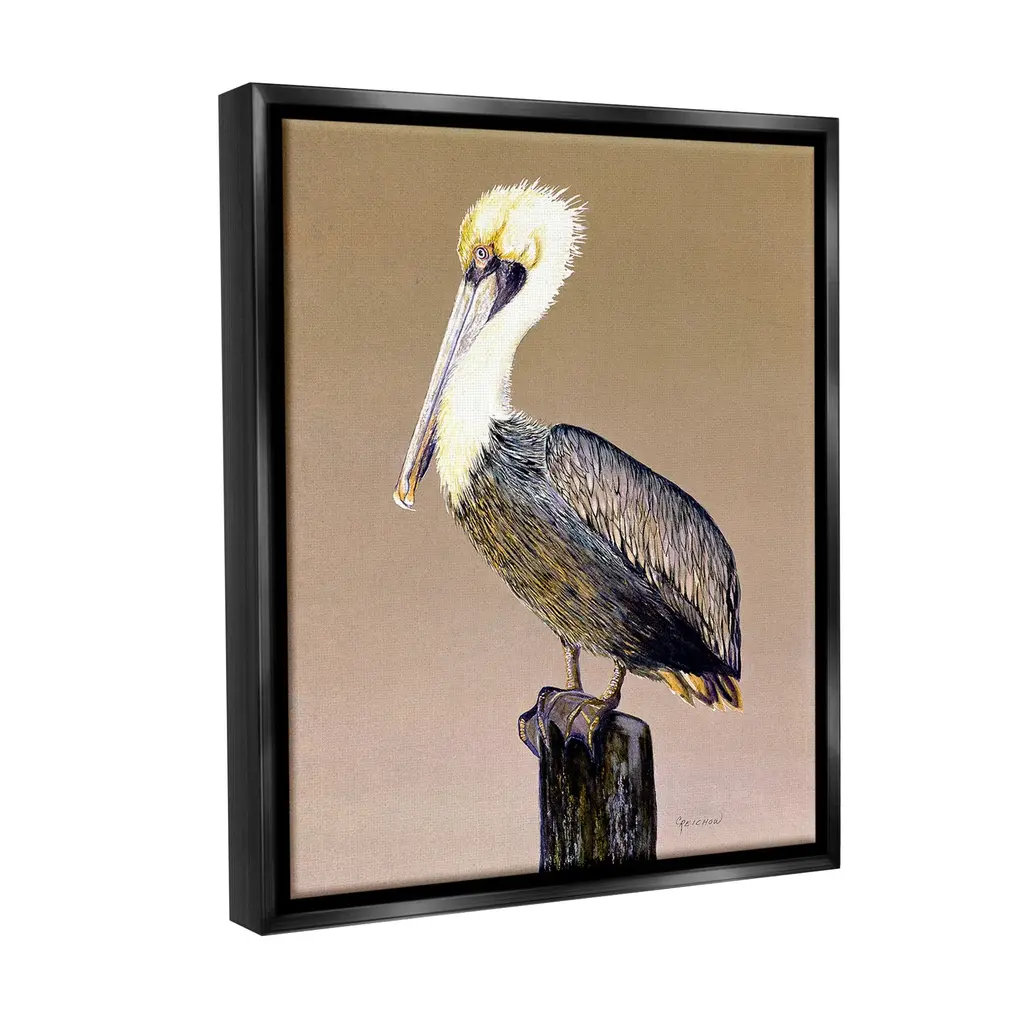 Elevate your home or office to the next level with Stupell Framed Floating Canvas Wall Art. Our premium hand-stretched canvas is mounted securely into a sturdy lightweight frame. The museum-style gap between the wrapped canvas and the box frame gives the illusion of floating artwork. Stupell Wall Art is made in the USA.Features: Dimensions: 17 x 1.7 x 21 Frame, 16 x 1.5 x 20 Canvas ArtFloating Frame Canvas Products are available in sizes 17"x21" and 25"x31". All Floating Frame Canvas Products have a 1.7" Depth.Wall Art is Ready to Hang with Hardware Free Hanging. No Installation required. For Easy Set Up Lean or Layer Artwork on Shelf or Against Wall. Artwork is Permently Fixed into the Frame.Our elevated 1.7" Thick Floating Frame is the perfect complement to our canvas style Wall Art. We use only the highest quality inks in house with industry leading printing solutions. Canvas is hand stretched over a durable wood foundation and then mounted securly into a Modern Box Frame. Made in the USA.Artwork Relates To: Animal, Bird, Waterfowl, Pelican, Beak, Traditional, NatureDesign by Christine Reichow