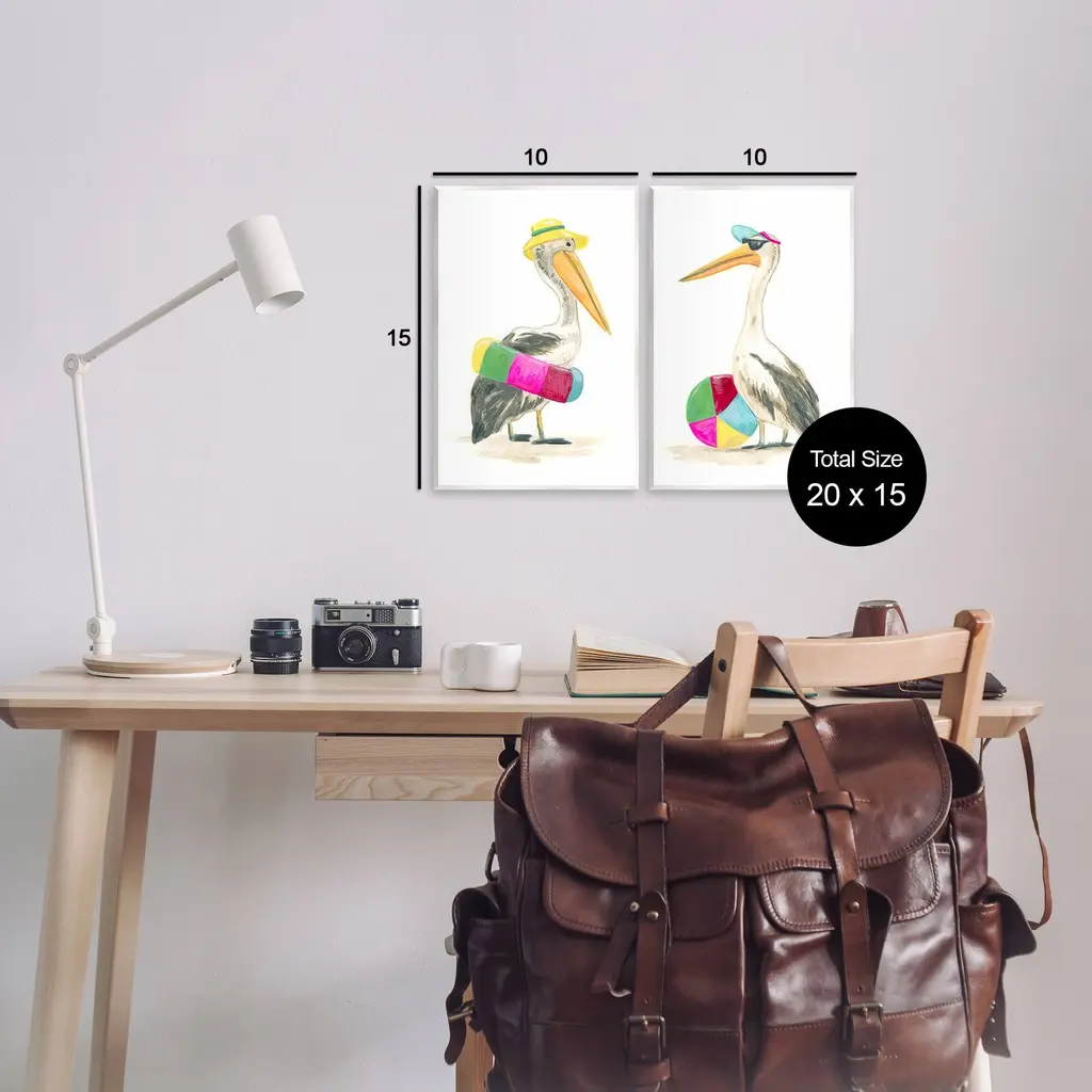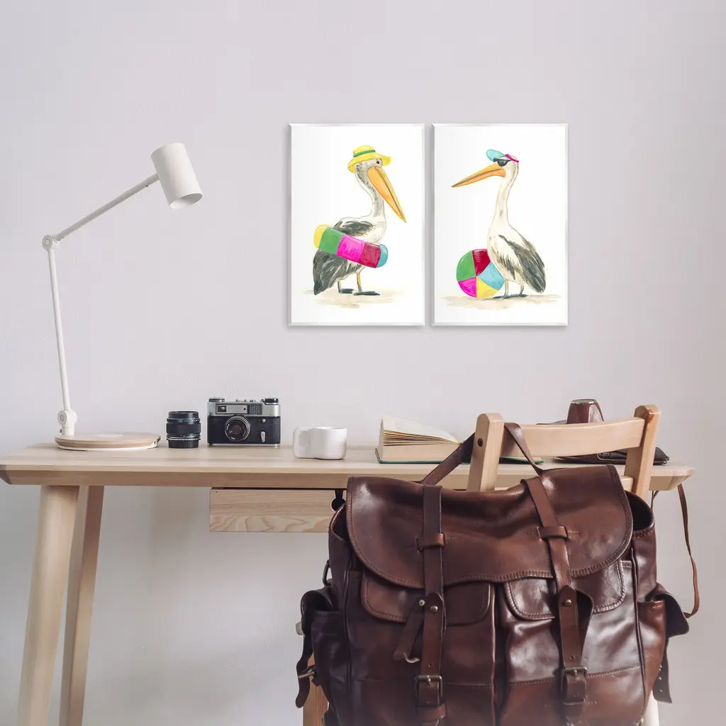 Fill any space with Stupell Wall Art Sets. Our wall plaques start as high-quality lithograph prints mounted on durable 0.5-inch thick MDF wood. Each piece is hand finished and comes with a fresh layer of white foil on the sides to give it a crisp, clean look. Plaques arrive ready to hang without installation and come with removable plastic corners to keep them from damage in transit. Stupell Industries Wall Art is made in the USA.Features: Dimensions: 2 Piece Set, Each Panel is 10 x 0.5 x 15 InchesWall Plaque Set Sizes Include Standard: 2pc, Each is 10 x 0.5 x 15 Oversized: 2pc, Each is 13 x 0.5 x 19Wall Art is Ready to Hang with Hardware Free Hanging. No installation required. For Easy Set Up Lean or Layer Artwork on Shelf or Against Wall.All of our wall plaques start off as high quality lithograph prints that are then mounted on durable 0.5 inch thick MDF wood. Each piece is hand finished and comes with a fresh layer of foil on the sides to give it a crisp clean look. Made In USA.Artwork Relates To: Animal, Bird, Waterfowl, Pelican, Swimming Ring, Beach BallDesign by June Erica Vess