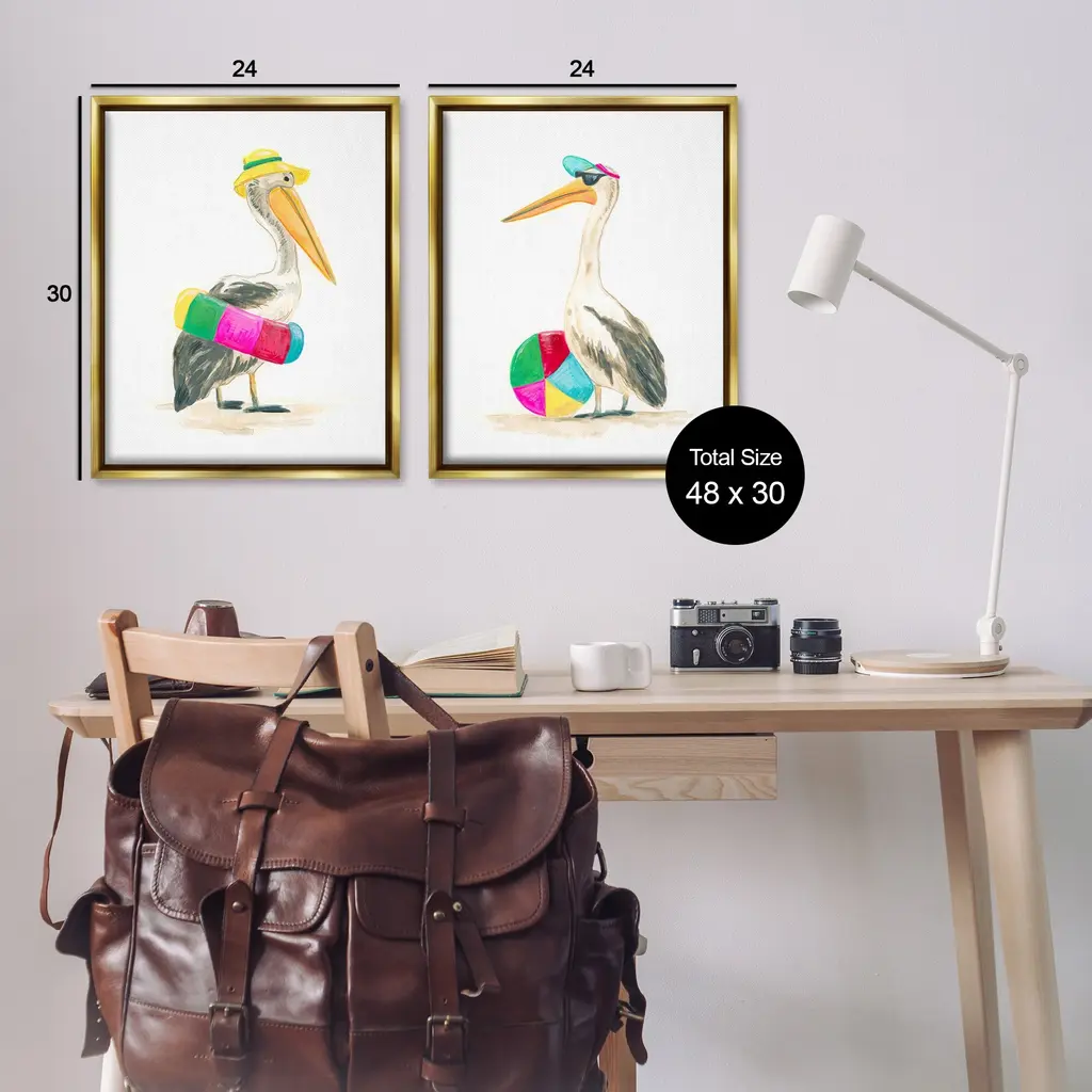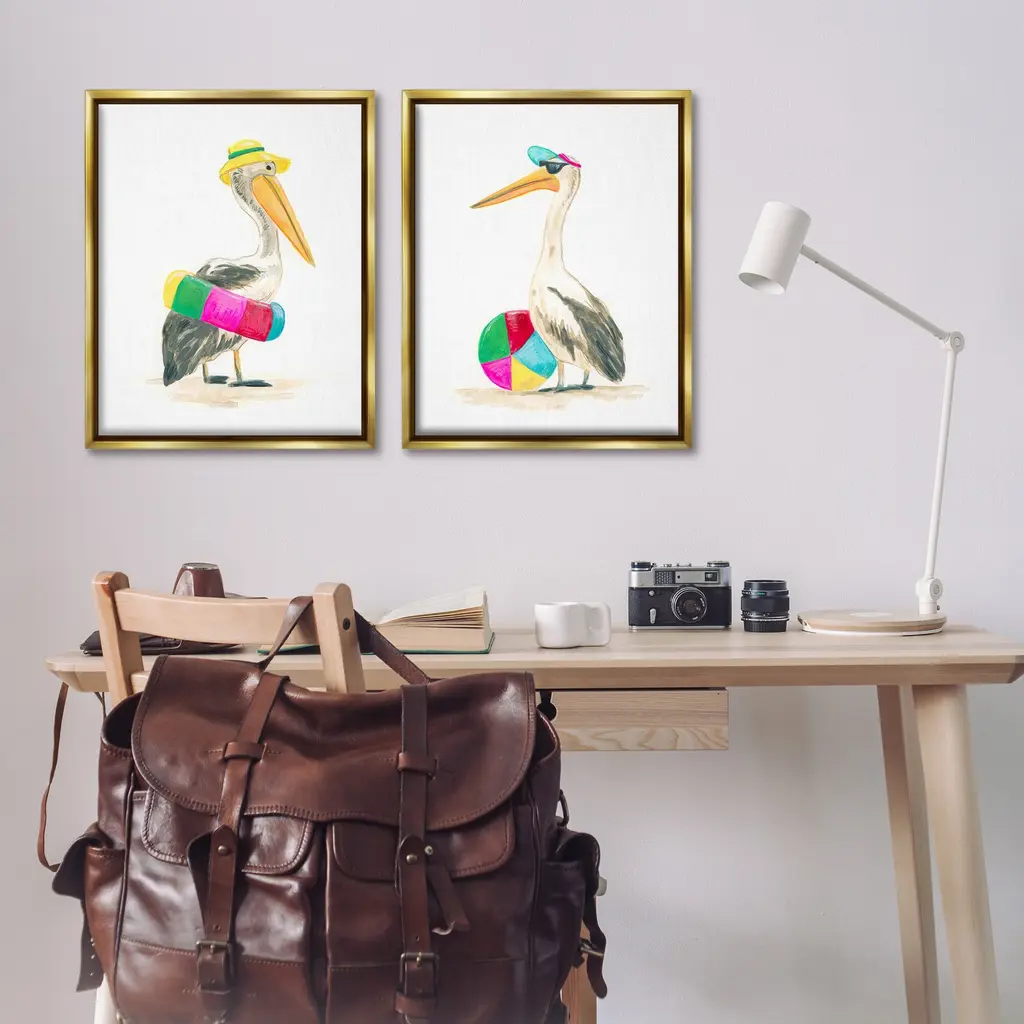 Elevate your home or office to the next level with Stupell Framed Floating Canvas Wall Art. Our premium hand-stretched canvas is mounted securely into a sturdy lightweight frame. The museum-style gap between the wrapped canvas and the box frame gives the illusion of floating artwork. Stupell Wall Art is made in the USA.Features: Dimensions: 2 Piece Set, Each Frame is 17 x 1.7 x 21Two Piece Floater Framed Canvas are available as 17x21 or 25x31 Panels. All Floater Frame Products have a 1.7" Depth.Wall Art is Ready to Hang with Hardware Free Hanging. No Installation required. For Easy Set Up Lean or Layer Artwork on Shelf or Against Wall. Artwork is Permently Fixed into the Frame.Our elevated 1.7" Thick Floating Frame is the perfect complement to our canvas style Wall Art. We use only the highest quality inks in house with industry leading printing solutions. Canvas is hand stretched over a durable wood foundation and then mounted securly into a Modern Box Frame. Made in the USA.Artwork Relates To: Animal, Bird, Waterfowl, Pelican, Swimming Ring, Beach Ball, Humor, SummerDesign by June Erica Vess