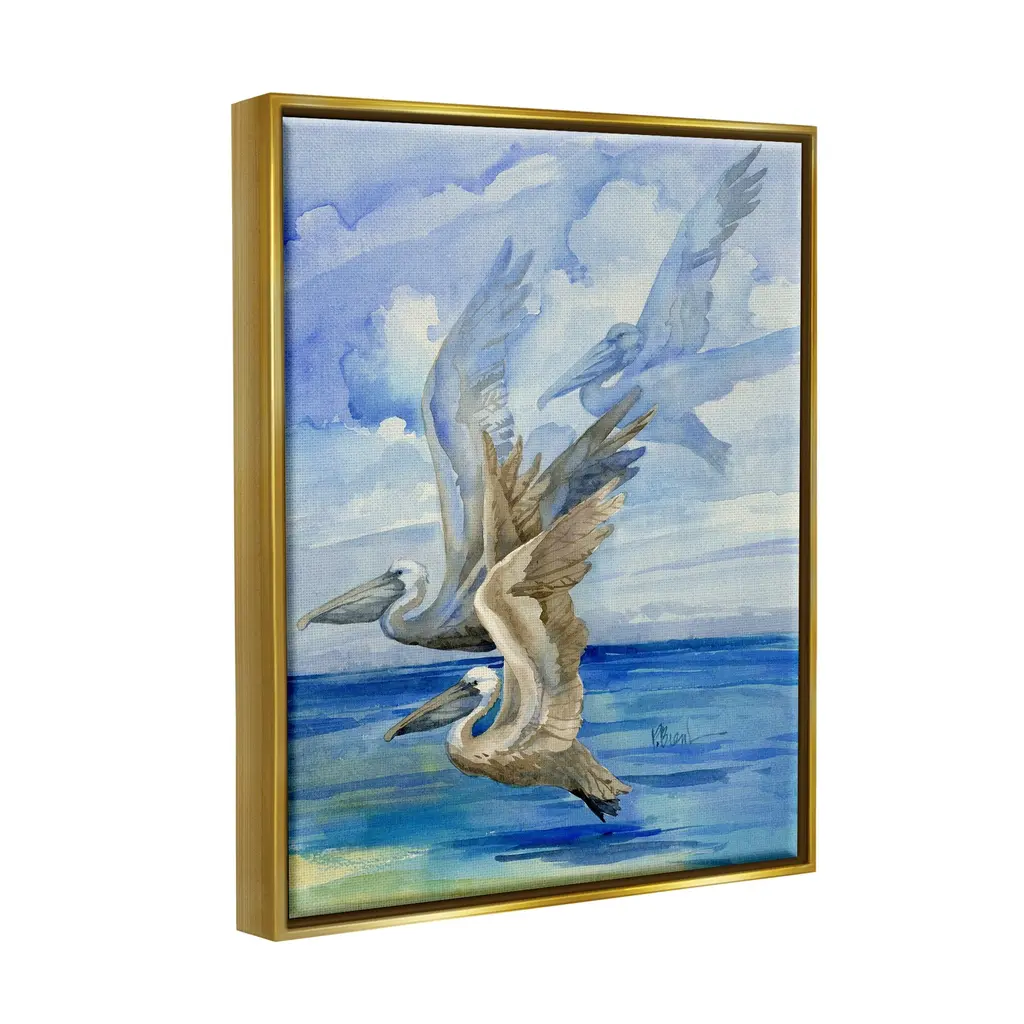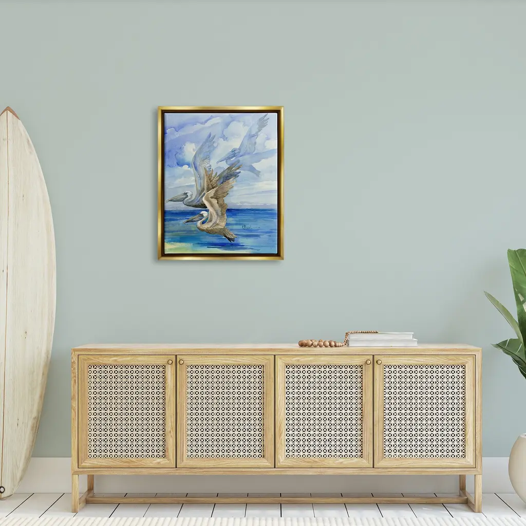 Elevate your home or office to the next level with Stupell Framed Floating Canvas Wall Art. Our premium hand stretched canvas is mounted securly into a sturdy lightweight frame. The museum style gap between wrapped canvas and box frame gives the illusion of floating artwork.Features:Floating Frame Sizes IncludeStandard: 21 x 1.7 x 17Oversized: 31 x 1.7 x 25Wall Art is Ready to Hang - No Installation or Hardware Needed. For Easy Set Up Lean or Layer Artwork on Shelf or Against Wall.Artwork Relates To: Painting, Bird, Animal, Waterfowl, Pelicans, Ocean, Beach, ShoreOur elevated 1.7" Thick Floating Frame is the perfect complement to our canvas style Wall Art. We use only the highest quality inks in house with industry leading printing solutions. Canvas is hand stretched over a durable wood foundation and then mounted securly into a Modern Box Frame. Made in the USA.Design by Paul Brent