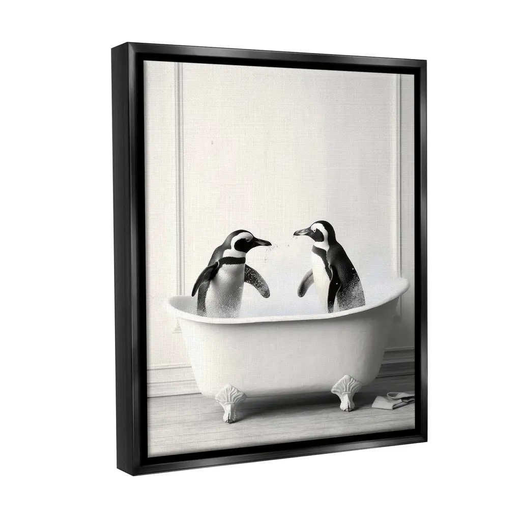 Elevate your home or office to the next level with Stupell Framed Floating Canvas Wall Art. Our premium hand-stretched canvas is mounted securely into a sturdy lightweight frame. The museum-style gap between the wrapped canvas and the box frame gives the illusion of floating artwork. Stupell Wall Art is made in the USA.Features: Dimensions: 17 x 1.7 x 21 Frame, 16 x 1.5 x 20 Canvas ArtFloating Frame Canvas Products are available in sizes 17"x21" and 25"x31". All Floating Frame Canvas Products have a 1.7" Depth.Wall Art is Ready to Hang with Hardware Free Hanging. No Installation required. For Easy Set Up Lean or Layer Artwork on Shelf or Against Wall. Artwork is Permently Fixed into the Frame.Our elevated 1.7" Thick Floating Frame is the perfect complement to our canvas style Wall Art. We use only the highest quality inks in house with industry leading printing solutions. Canvas is hand stretched over a durable wood foundation and then mounted securly into a Modern Box Frame. Made in the USA.Artwork Relates To: Bathing, Tub, Bathtub, Animal, Bird, Penguin, Minimal, BathroomDesign by Lazar Studio
