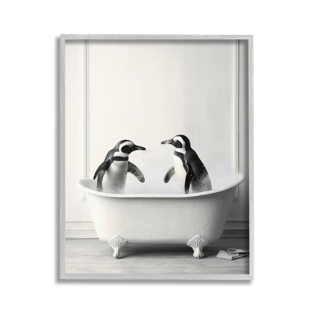 Elevate your home or office to the next level with Stupell Framed Floating Canvas Wall Art. Our premium hand-stretched canvas is mounted securely into a sturdy lightweight frame. The museum-style gap between the wrapped canvas and the box frame gives the illusion of floating artwork. Stupell Wall Art is made in the USA.Features: Dimensions: 17 x 1.7 x 21 Frame, 16 x 1.5 x 20 Canvas ArtFloating Frame Canvas Products are available in sizes 17"x21" and 25"x31". All Floating Frame Canvas Products have a 1.7" Depth.Wall Art is Ready to Hang with Hardware Free Hanging. No Installation required. For Easy Set Up Lean or Layer Artwork on Shelf or Against Wall. Artwork is Permently Fixed into the Frame.Our elevated 1.7" Thick Floating Frame is the perfect complement to our canvas style Wall Art. We use only the highest quality inks in house with industry leading printing solutions. Canvas is hand stretched over a durable wood foundation and then mounted securly into a Modern Box Frame. Made in the USA.Artwork Relates To: Bathing, Tub, Bathtub, Animal, Bird, Penguin, Minimal, BathroomDesign by Lazar Studio
