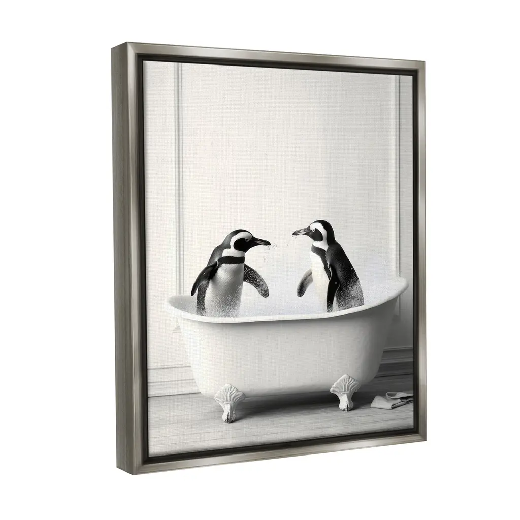 Elevate your home or office to the next level with Stupell Framed Floating Canvas Wall Art. Our premium hand-stretched canvas is mounted securely into a sturdy lightweight frame. The museum-style gap between the wrapped canvas and the box frame gives the illusion of floating artwork. Stupell Wall Art is made in the USA.Features: Dimensions: 17 x 1.7 x 21 Frame, 16 x 1.5 x 20 Canvas ArtFloating Frame Canvas Products are available in sizes 17"x21" and 25"x31". All Floating Frame Canvas Products have a 1.7" Depth.Wall Art is Ready to Hang with Hardware Free Hanging. No Installation required. For Easy Set Up Lean or Layer Artwork on Shelf or Against Wall. Artwork is Permently Fixed into the Frame.Our elevated 1.7" Thick Floating Frame is the perfect complement to our canvas style Wall Art. We use only the highest quality inks in house with industry leading printing solutions. Canvas is hand stretched over a durable wood foundation and then mounted securly into a Modern Box Frame. Made in the USA.Artwork Relates To: Bathing, Tub, Bathtub, Animal, Bird, Penguin, Minimal, BathroomDesign by Lazar Studio