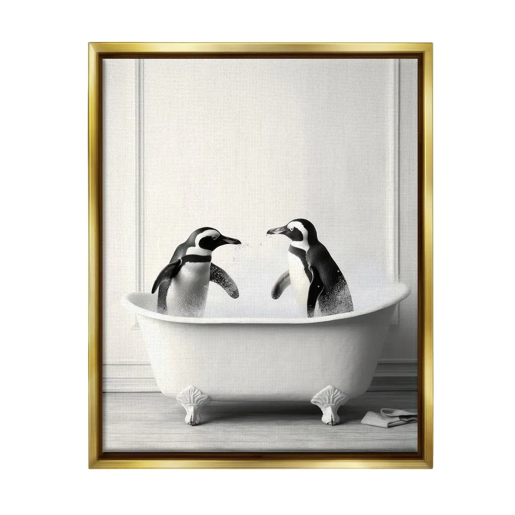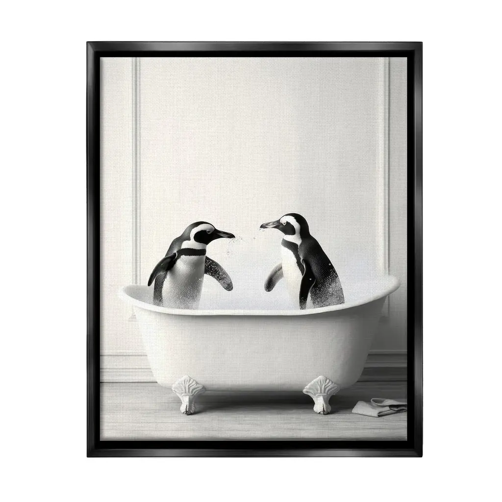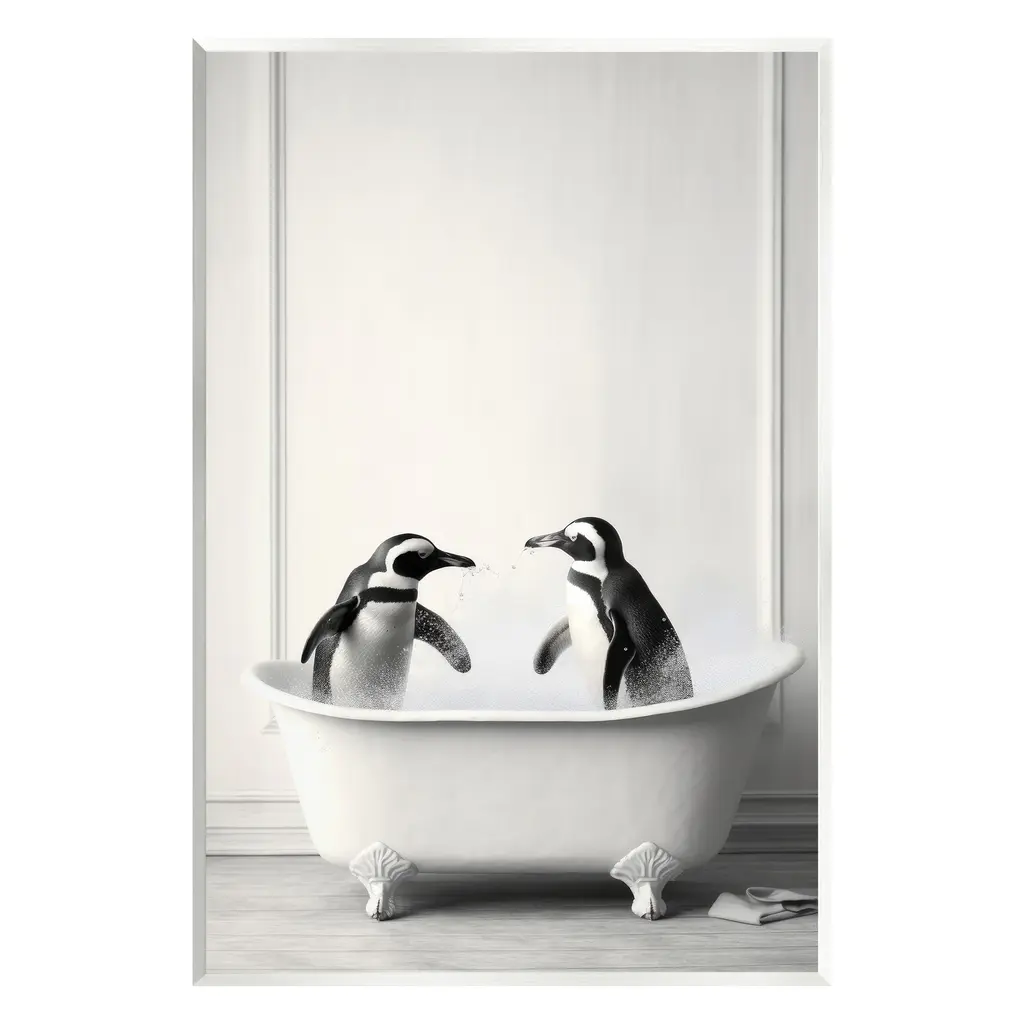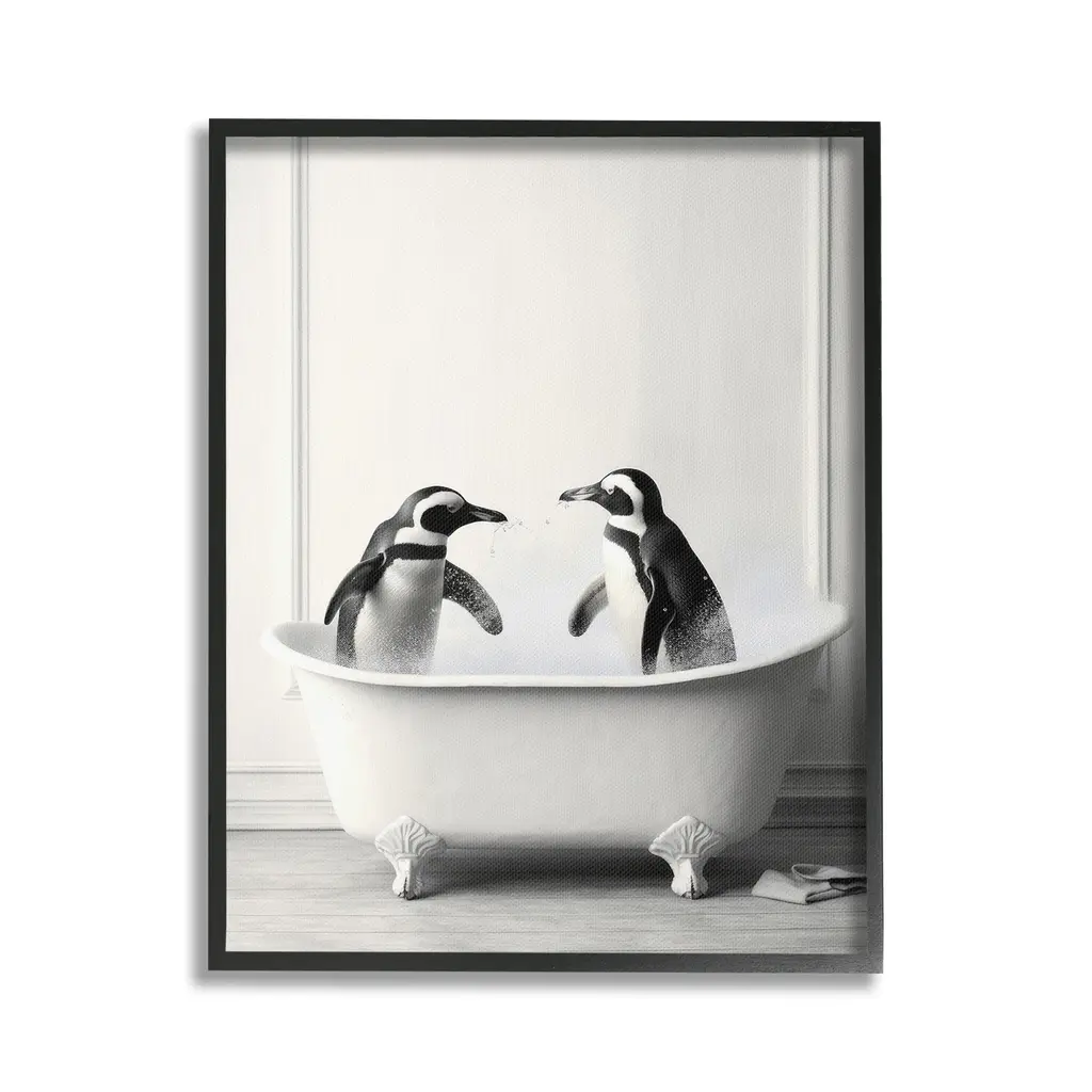 Add dimension to any room with our textured Framed Giclee Artwork. Our framed artwork is securely mounted into a 1.5-inch thick wood grain frame and ready to hang. Frames are available in three alluring styles: black, gray farmhouse and white. In addition, you should check out our oversized options if you want a statement piece. Stupell Wall Art is made in the USA.Features: Dimensions: 11 x 1.5 x 14 FramedFramed Giclee Products are available in the sizes 11"x14", 16"x20" or 24"x30". All Framed Giclee Products have a 1.5" Depth. Wall Art is Ready to Hang with Hardware Free Hanging. No installation required. For Easy Set Up Lean or Layer Artwork on Shelf or Against Wall.Our giclée prints are carefully mounted on a durable MDF backing, and then perfectly finished in a 1.5 inch thick woodgrain frame. Mounted frame colors include black, gray farmhouse and white. Made In USA.Artwork Relates To: Bathing, Tub, Bathtub, Animal, Bird, Penguin, Minimal, BathroomDesign by Lazar Studio