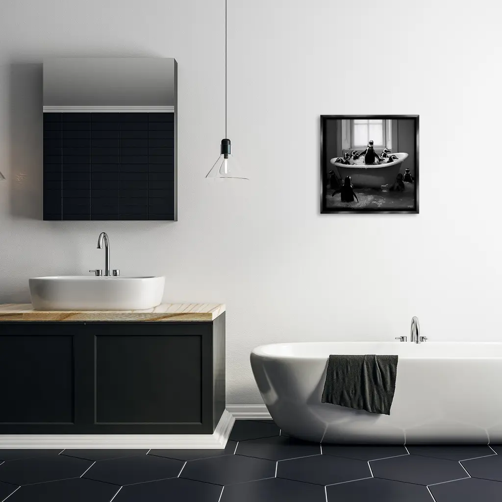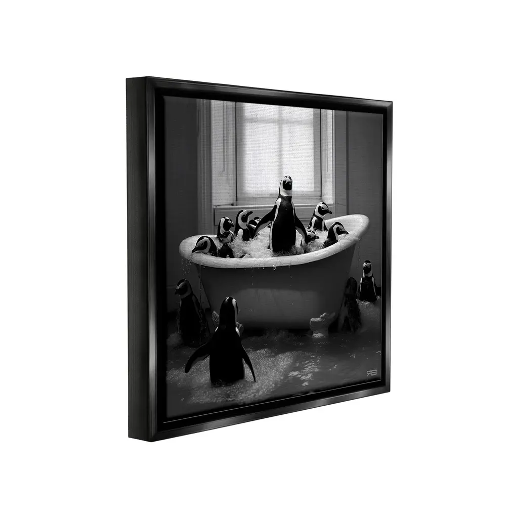 Elevate your home or office to the next level with Stupell Framed Floating Canvas Wall Art. Our premium hand-stretched canvas is mounted securely into a sturdy lightweight frame. The museum-style gap between the wrapped canvas and the box frame gives the illusion of floating artwork. Stupell Wall Art is made in the USA.Features: Dimensions: 18 x 1.7 x 18 Frame, 17 x 1.5 x 17 Canvas ArtFloating Frame Canvas Products are available in sizes 18"x18" and 25"x25". All Floating Frame Canvas Products have a 1.7" Depth.Wall Art is Ready to Hang with Hardware Free Hanging. No Installation required. For Easy Set Up Lean or Layer Artwork on Shelf or Against Wall. Artwork is Permently Fixed into the Frame.Our elevated 1.7" Thick Floating Frame is the perfect complement to our canvas style Wall Art. We use only the highest quality inks in house with industry leading printing solutions. Canvas is hand stretched over a durable wood foundation and then mounted securly into a Modern Box Frame. Made in the USA.Artwork Relates To: Tub, Bathing, Bathtub, Bathroom, Animal, Penguin, Flock, MonochromeDesign by RB