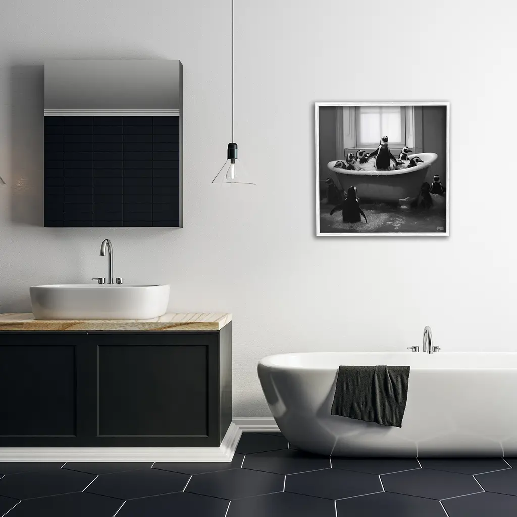 Add dimension to any room with our textured Framed Giclee Artwork. Our framed artwork is securely mounted into a 1.5-inch thick wood grain frame and ready to hang. Frames are available in three alluring styles: black, gray farmhouse and white. In addition, you should check out our oversized options if you want a statement piece. Stupell Wall Art is made in the USA.Features: Dimensions: 12 x 1.5 x 12 FramedFramed Giclee Product Sizes Include 12"x12", 17"x17", and 24"x24". Framed Giclee Products have a 1.5" Depth. Wall Art is Ready to Hang with Hardware Free Hanging. No installation required. For Easy Set Up Lean or Layer Artwork on Shelf or Against Wall.Our giclée prints are carefully mounted on a durable MDF backing, and then perfectly finished in a 1.5 inch thick woodgrain frame. Mounted frame colors include black, gray farmhouse and white. Made In USA.Artwork Relates To: Tub, Bathing, Bathtub, Bathroom, Animal, Penguin, Flock, MonochromeDesign by RB