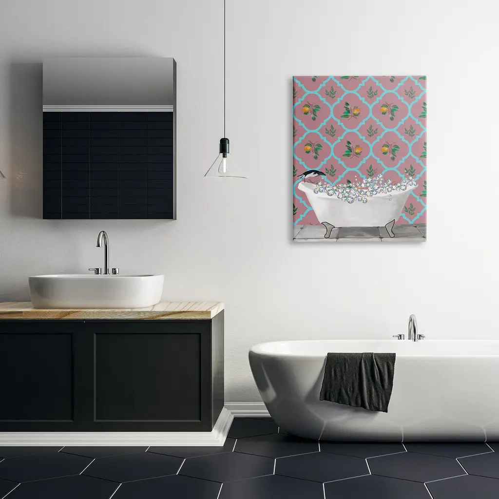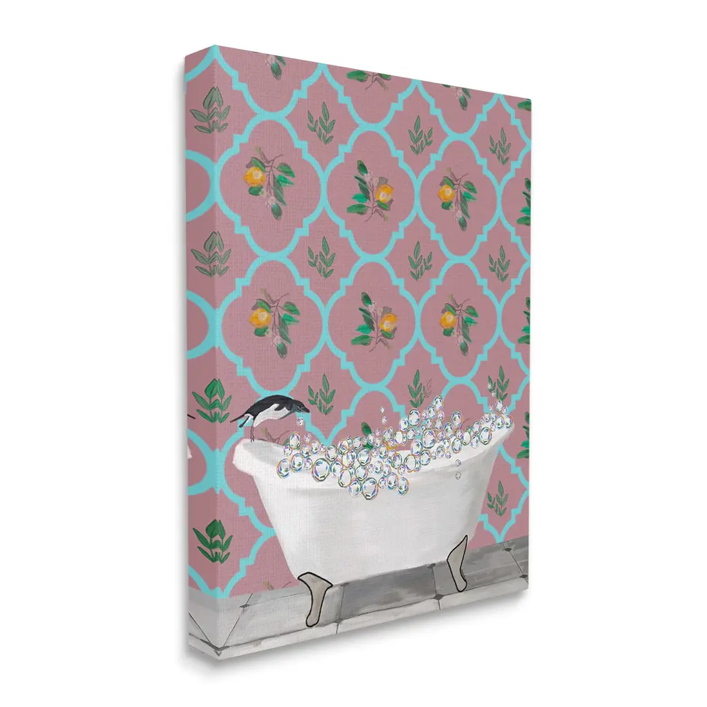 We create our stretched canvas to the highest standards. Using only the highest quality inks and canvas on Mimaki printers, we hand-cut and stretch each piece over a 1.5-inch thick wooden frame for hanging. As a result, the art comes ready to hang on the sturdy ledge with no installation required. Stupell Wall Art is made in the USA.Features: Dimensions: 16 x 1.5 x 20 InchesStretched Canvas Sizes Include Standard: 16 x 1.5 x 20 Large: 20 x 1.5 x 30 X-Large: 30 x 1.5 x 40 Oversized: 36 x 1.5 x 48Wall Art is Ready to Hang with Hardware Free Hanging. No installation required. For Easy Set Up Lean or Layer Artwork on Shelf or Against Wall.Our stretched canvas is created with the highest standards. We use only the highest quality inks and canvas on our in house Mimaki printers, and then hand cut and stretch each piece over a 1.5 inch thick wooden frame for hanging. Made In USA.Artwork Relates To: Bathing, Bathtub, Tub, Pattern, Bathroom, Bubbles, Floral, Citrus, Trellis, PenguinDesign by Amelia Noyes