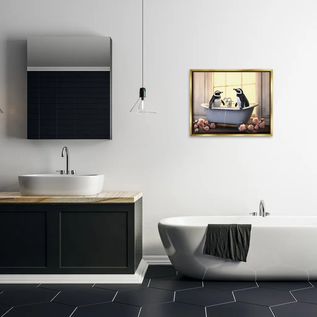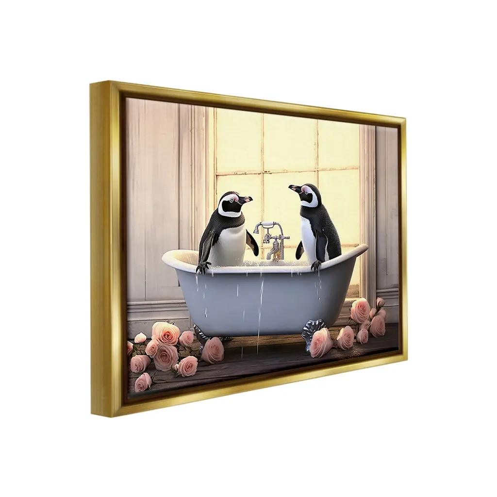 Elevate your home or office to the next level with Stupell Framed Floating Canvas Wall Art. Our premium hand-stretched canvas is mounted securely into a sturdy lightweight frame. The museum-style gap between the wrapped canvas and the box frame gives the illusion of floating artwork. Stupell Wall Art is made in the USA.Features: Dimensions: 21 x 1.7 x 17 Frame, 20 x 1.5 x 16 Canvas ArtFloating Frame Canvas Products are available in sizes 21"x17" and 31"x25". All Floating Frame Canvas Products have a 1.7" Depth.Wall Art is Ready to Hang with Hardware Free Hanging. No Installation required. For Easy Set Up Lean or Layer Artwork on Shelf or Against Wall. Artwork is Permently Fixed into the Frame.Our elevated 1.7" Thick Floating Frame is the perfect complement to our canvas style Wall Art. We use only the highest quality inks in house with industry leading printing solutions. Canvas is hand stretched over a durable wood foundation and then mounted securly into a Modern Box Frame. Made in the USA.Artwork Relates To: Bathroom, Animal, Bird, Penguin, Bathtub, Tub, Flower, BlossomDesign by Lazar Studio