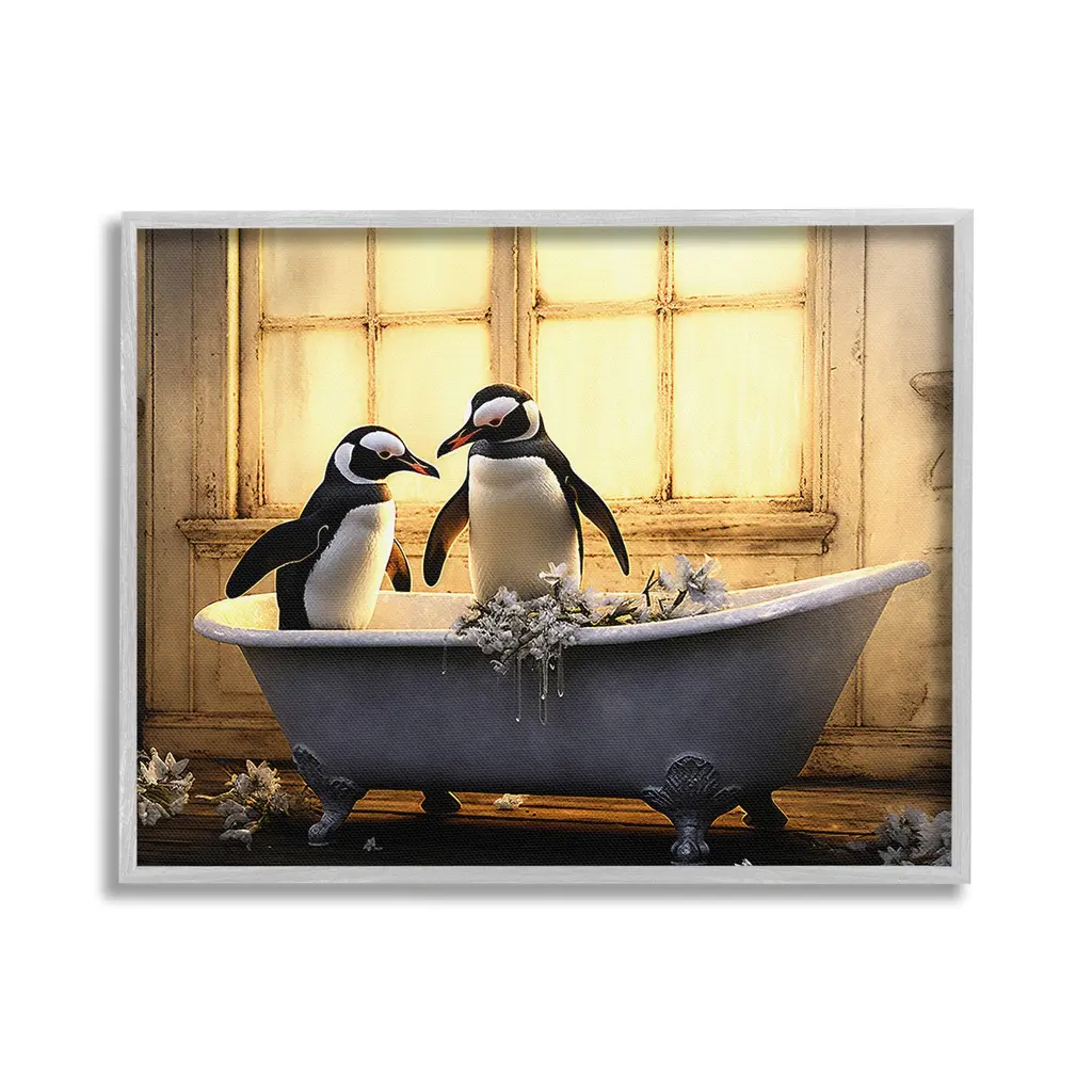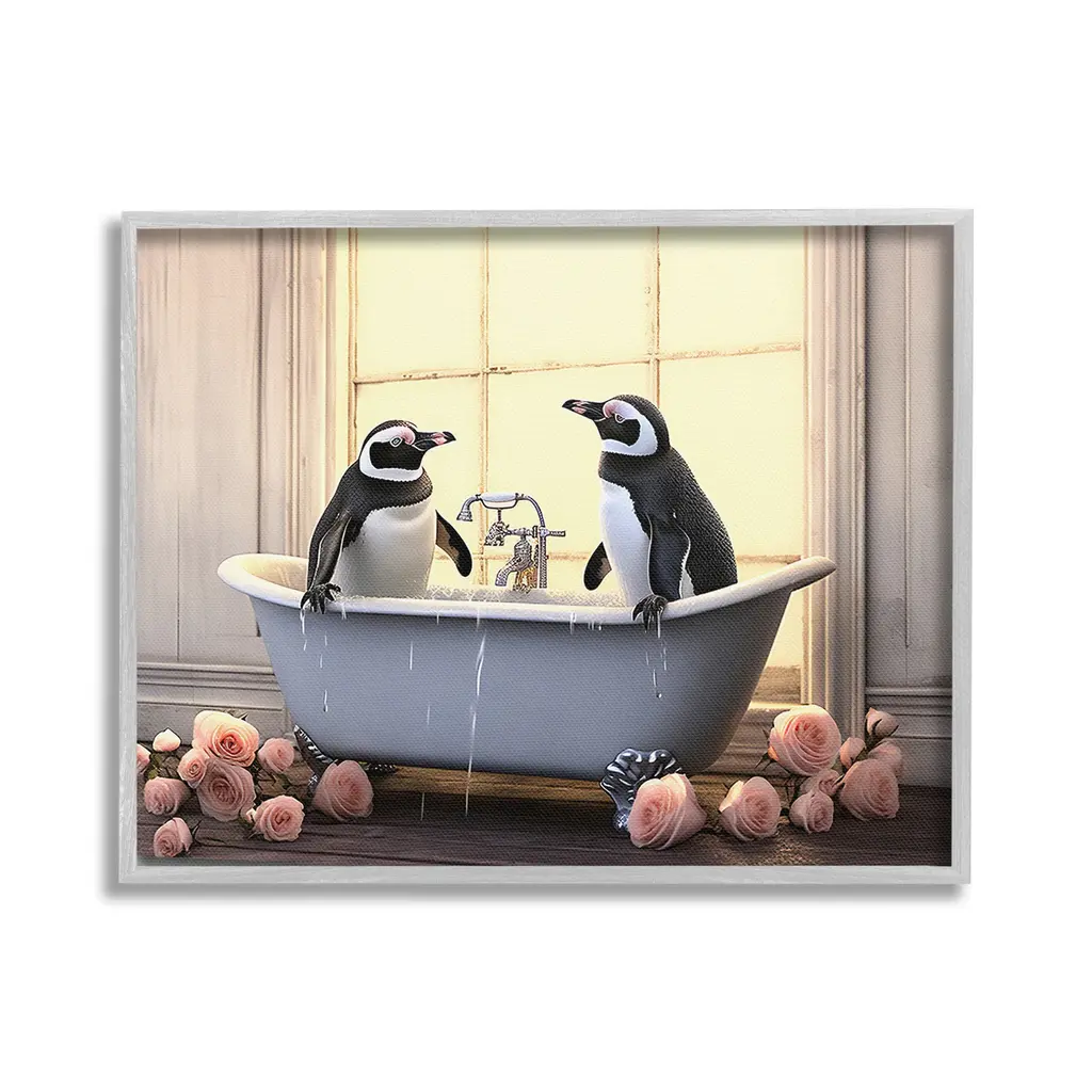 Add dimension to any room with our textured Framed Giclee Artwork. Our framed artwork is securely mounted into a 1.5-inch thick wood grain frame and ready to hang. Frames are available in three alluring styles: black, gray farmhouse and white. In addition, you should check out our oversized options if you want a statement piece. Stupell Wall Art is made in the USA.Features: Dimensions: 14 x 1.5 x 11 FramedFramed Giclee Products are available in the sizes 14"x11", 20"x16" or 30"x24". All Framed Giclee Products have a 1.5" Depth. Wall Art is Ready to Hang with Hardware Free Hanging. No installation required. For Easy Set Up Lean or Layer Artwork on Shelf or Against Wall.Our giclée prints are carefully mounted on a durable MDF backing, and then perfectly finished in a 1.5 inch thick woodgrain frame. Mounted frame colors include black, gray farmhouse and white. Made In USA.Artwork Relates To: Bathroom, Animal, Bird, Penguin, Bathtub, Tub, Flower, BlossomDesign by Lazar Studio
