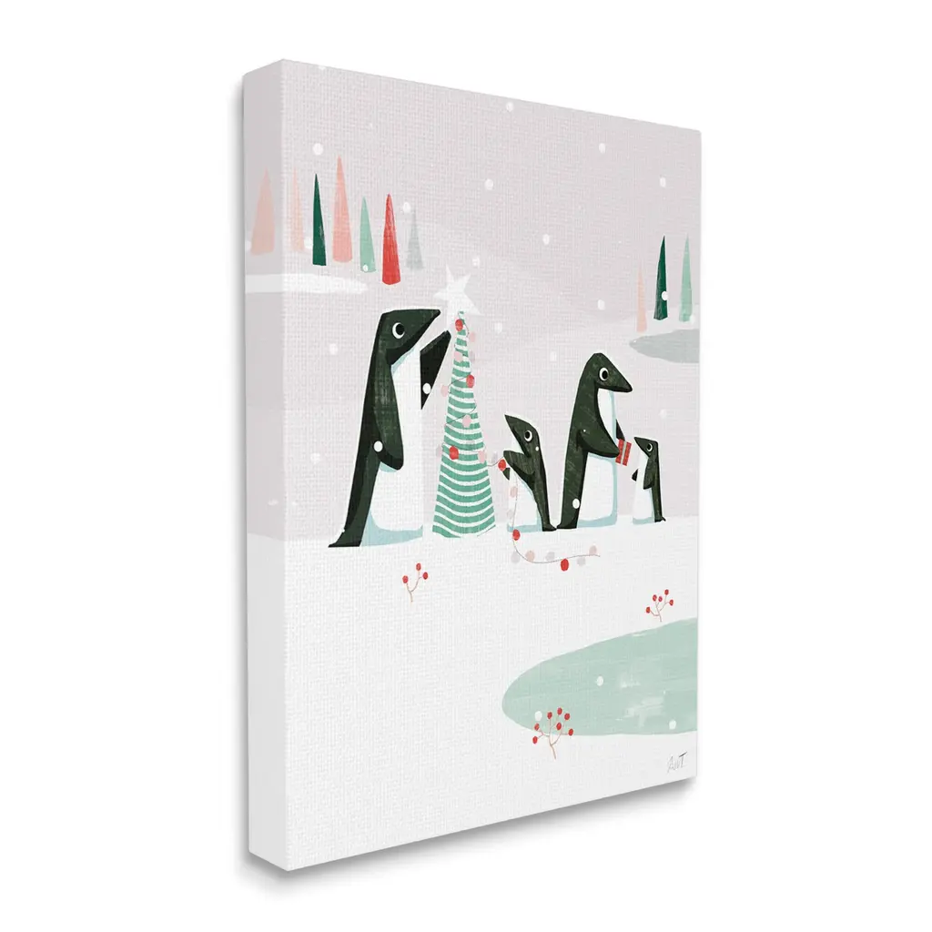 We create our stretched canvas to the highest standards. Using only the highest quality inks and canvas on Mimaki printers, we hand-cut and stretch each piece over a 1.5-inch thick wooden frame for hanging. As a result, the art comes ready to hang on the sturdy ledge with no installation required. Stupell Wall Art is made in the USA.Features: Dimensions: 16 x 1.5 x 20 InchesStretched Canvas Sizes Include Standard: 16 x 1.5 x 20 Large: 20 x 1.5 x 30 X-Large: 30 x 1.5 x 40 Oversized: 36 x 1.5 x 48Wall Art is Ready to Hang - No Installation or Hardware Needed. For Easy Set Up Lean or Layer Artwork on Shelf or Against Wall.Our stretched canvas is created with the highest standards. We use only the highest quality inks and canvas on our in house Mimaki printers, and then hand cut and stretch each piece over a 1.5 inch thick wooden frame for hanging. Made In USA.Artwork Relates To: Penguin, Christmas Tree, Winter, Snow, Holiday, Seasonal, Bird, AnimalDesign by Andrew Thornton