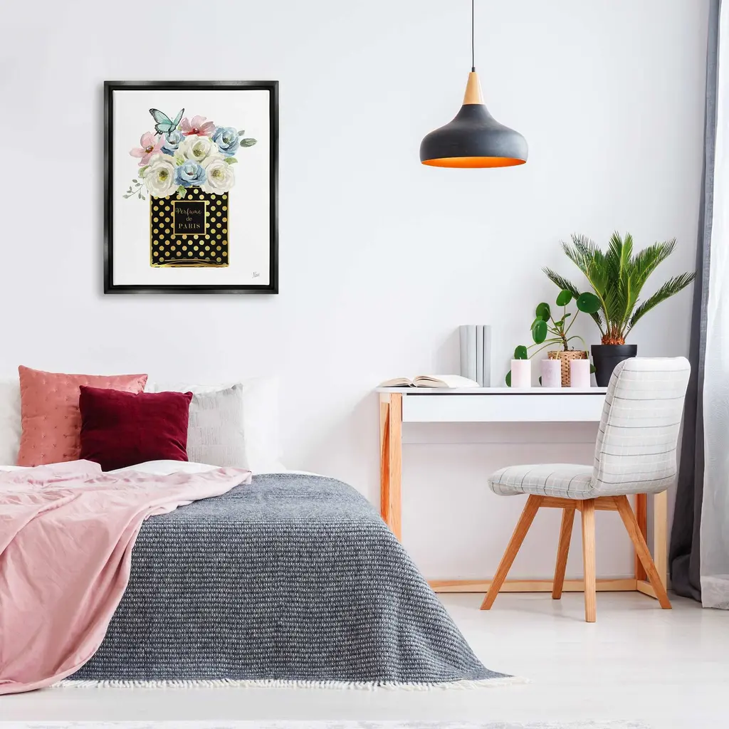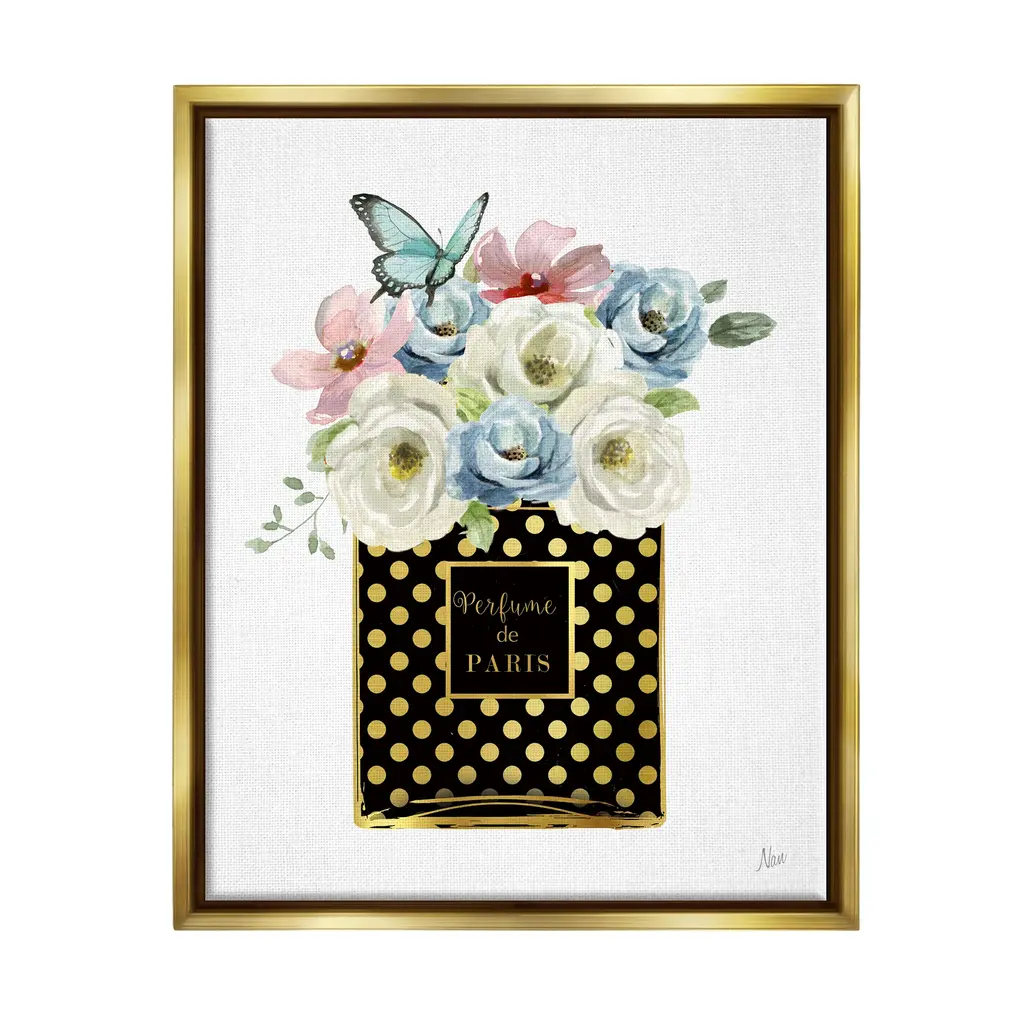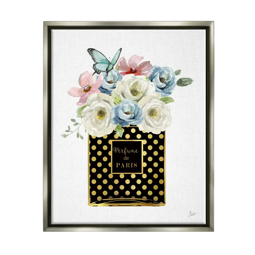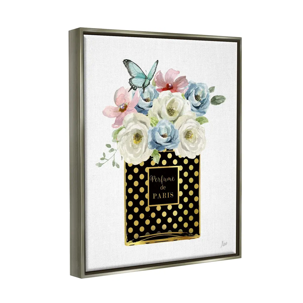 Elevate your home or office to the next level with Stupell Framed Floating Canvas Wall Art. Our premium hand-stretched canvas is mounted securely into a sturdy lightweight frame. The museum-style gap between the wrapped canvas and the box frame gives the illusion of floating artwork. Stupell Wall Art is made in the USA.Features: Dimensions: 17 x 1.7 x 21 Frame, 16 x 1.5 x 20 Canvas ArtFloating Frame Sizes Include Standard: 17 x 1.7 x 21 Oversized: 25 x 1.7 x 31Wall Art is Ready to Hang - No Installation or Hardware Needed. For Easy Set Up Lean or Layer Artwork on Shelf or Against Wall.Our elevated 1.7" Thick Floating Frame is the perfect complement to our canvas style Wall Art. We use only the highest quality inks in house with industry leading printing solutions. Canvas is hand stretched over a durable wood foundation and then mounted securly into a Modern Box Frame. Made in the USA.Artwork Relates To: Floral, Flower, Plant, Rose, Flower Arrangement, Flower Bouquet, Butterfly, Perfume de ParisDesign by Nan