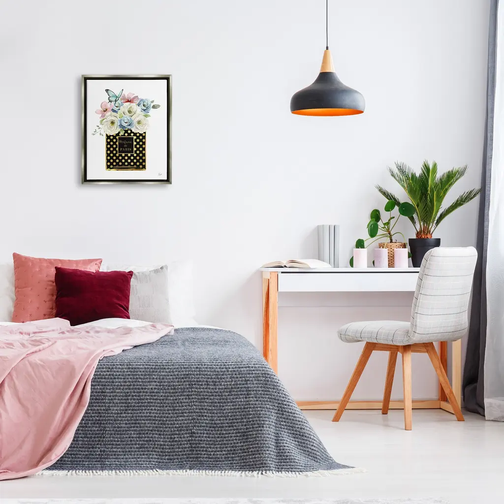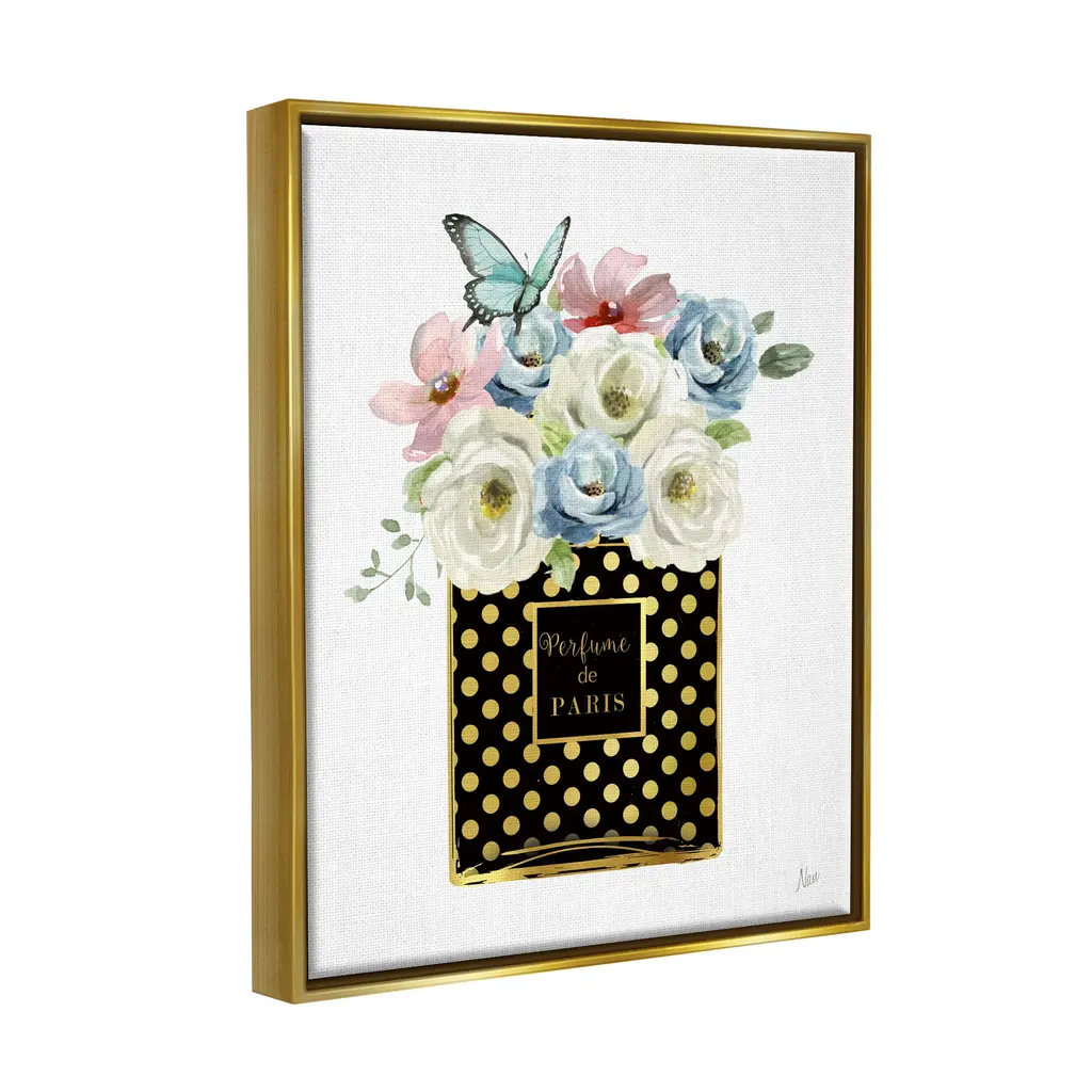 Elevate your home or office to the next level with Stupell Framed Floating Canvas Wall Art. Our premium hand-stretched canvas is mounted securely into a sturdy lightweight frame. The museum-style gap between the wrapped canvas and the box frame gives the illusion of floating artwork. Stupell Wall Art is made in the USA.Features: Dimensions: 17 x 1.7 x 21 Frame, 16 x 1.5 x 20 Canvas ArtFloating Frame Sizes Include Standard: 17 x 1.7 x 21 Oversized: 25 x 1.7 x 31Wall Art is Ready to Hang - No Installation or Hardware Needed. For Easy Set Up Lean or Layer Artwork on Shelf or Against Wall.Our elevated 1.7" Thick Floating Frame is the perfect complement to our canvas style Wall Art. We use only the highest quality inks in house with industry leading printing solutions. Canvas is hand stretched over a durable wood foundation and then mounted securly into a Modern Box Frame. Made in the USA.Artwork Relates To: Floral, Flower, Plant, Rose, Flower Arrangement, Flower Bouquet, Butterfly, Perfume de ParisDesign by Nan