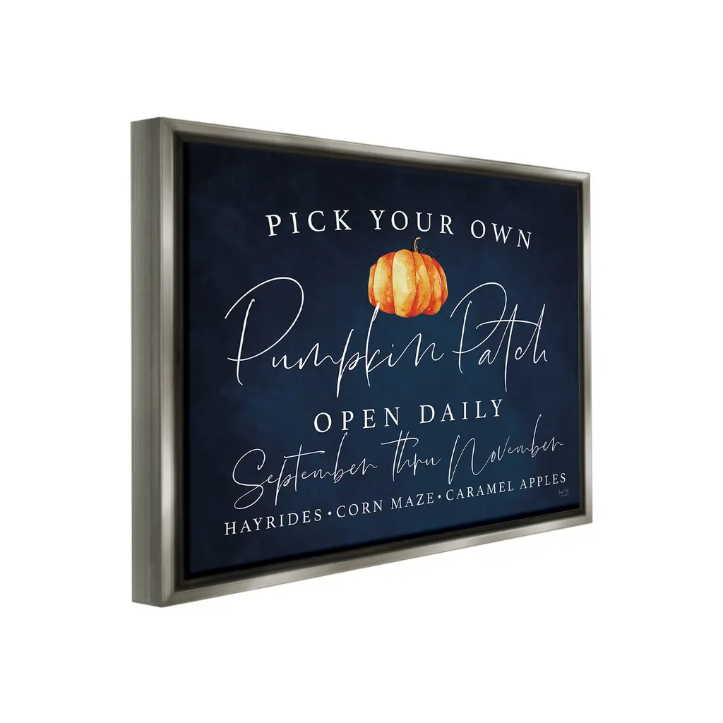 Elevate your home or office to the next level with Stupell Framed Floating Canvas Wall Art. Our premium hand-stretched canvas is mounted securely into a sturdy lightweight frame. The museum-style gap between the wrapped canvas and the box frame gives the illusion of floating artwork. Stupell Wall Art is made in the USA.Features: Dimensions: 21 x 1.7 x 17 Frame, 20 x 1.5 x 16 Canvas ArtFloating Frame Canvas Products are available in sizes 21"x17" and 31"x25". All Floating Frame Canvas Products have a 1.7" Depth.Wall Art is Ready to Hang with Hardware Free Hanging. No Installation required. For Easy Set Up Lean or Layer Artwork on Shelf or Against Wall. Artwork is Permently Fixed into the Frame.Our elevated 1.7" Thick Floating Frame is the perfect complement to our canvas style Wall Art. We use only the highest quality inks in house with industry leading printing solutions. Canvas is hand stretched over a durable wood foundation and then mounted securly into a Modern Box Frame. Made in the USA.Artwork Relates To: Fall, Autumn, Harvest, Garden, Patch, Country, Pick Your Own, Pumpkin PatchDesign by Lux + Me Designs