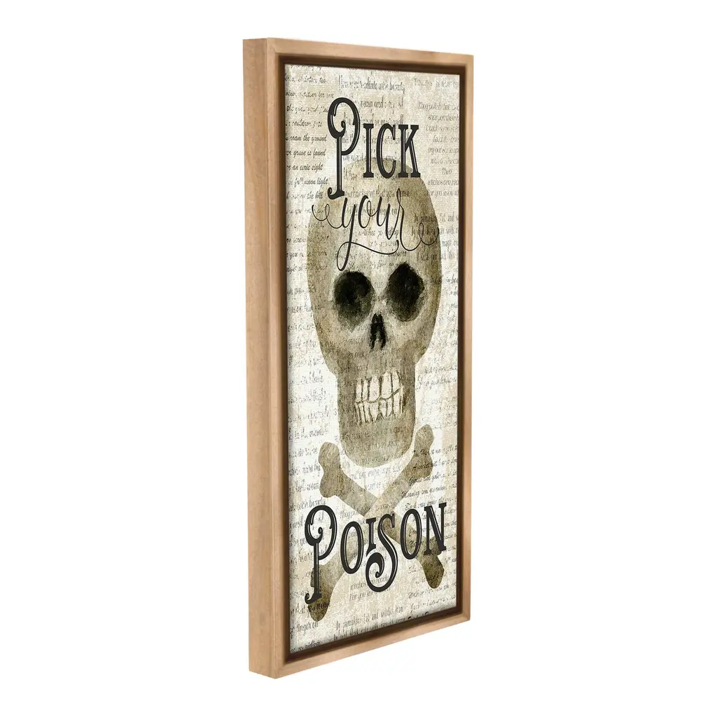 Elevate your home or office to the next level with Stupell Framed Floating Canvas Wall Art. Our premium hand-stretched canvas is mounted securely into a sturdy lightweight frame. The museum-style gap between the wrapped canvas and the box frame gives the illusion of floating artwork. Stupell Wall Art is made in the USA.Features: Dimensions: 11 x 1.7 x 25 Frame, 10 x 1.5 x 24 Canvas ArtFloating Frame Canvas Products are available in sizes 11"x25" and 14"x31". All Floating Frame Canvas Products have a 1.7" Depth.Wall Art is Ready to Hang with Hardware Free Hanging. No Installation required. For Easy Set Up Lean or Layer Artwork on Shelf or Against Wall. Artwork is Permently Fixed into the Frame.Our elevated 1.7" Thick Floating Frame is the perfect complement to our canvas style Wall Art. We use only the highest quality inks in house with industry leading printing solutions. Canvas is hand stretched over a durable wood foundation and then mounted securly into a Modern Box Frame. Made in the USA.Artwork Relates To: Potion, Poison, Skull, Halloween, Vintage, Rustic, Cursive, Pick Your PoisonDesign by Deane Beesley