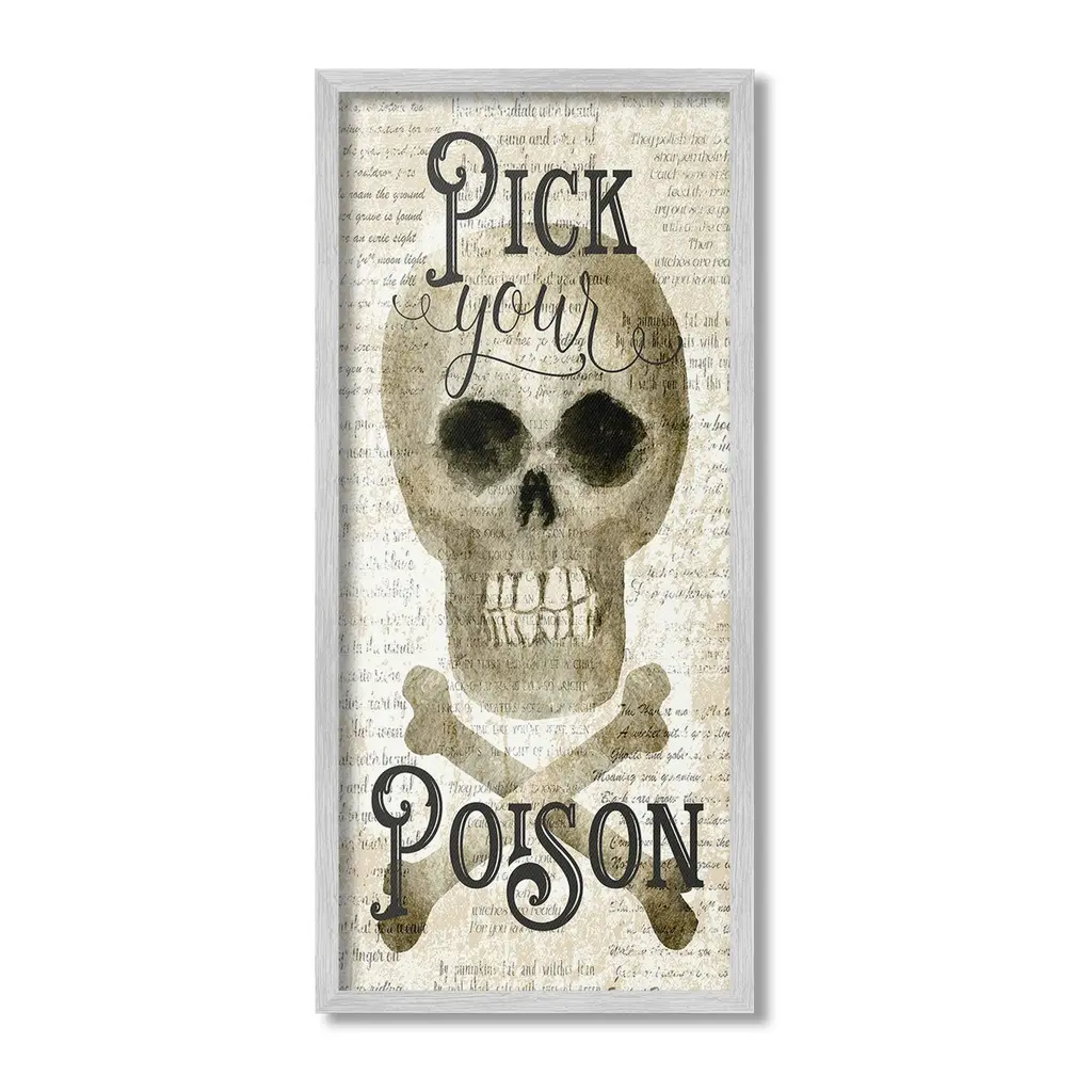 Elevate your home or office to the next level with Stupell Framed Floating Canvas Wall Art. Our premium hand-stretched canvas is mounted securely into a sturdy lightweight frame. The museum-style gap between the wrapped canvas and the box frame gives the illusion of floating artwork. Stupell Wall Art is made in the USA.Features: Dimensions: 11 x 1.7 x 25 Frame, 10 x 1.5 x 24 Canvas ArtFloating Frame Canvas Products are available in sizes 11"x25" and 14"x31". All Floating Frame Canvas Products have a 1.7" Depth.Wall Art is Ready to Hang with Hardware Free Hanging. No Installation required. For Easy Set Up Lean or Layer Artwork on Shelf or Against Wall. Artwork is Permently Fixed into the Frame.Our elevated 1.7" Thick Floating Frame is the perfect complement to our canvas style Wall Art. We use only the highest quality inks in house with industry leading printing solutions. Canvas is hand stretched over a durable wood foundation and then mounted securly into a Modern Box Frame. Made in the USA.Artwork Relates To: Potion, Poison, Skull, Halloween, Vintage, Rustic, Cursive, Pick Your PoisonDesign by Deane Beesley