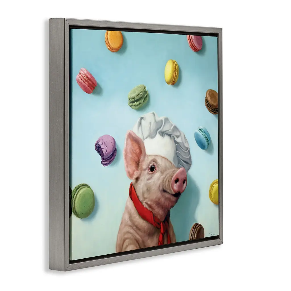 Elevate your home or office to the next level with Stupell Framed Floating Canvas Wall Art. Our premium hand-stretched canvas is mounted securely into a sturdy lightweight frame. The museum-style gap between the wrapped canvas and the box frame gives the illusion of floating artwork. Stupell Wall Art is made in the USA.Features: Dimensions: 18 x 1.7 x 18 Frame, 17 x 1.5 x 17 Canvas ArtFloating Frame Canvas Products are available in sizes 18"x18" and 25"x25". All Floating Frame Canvas Products have a 1.7" Depth.Wall Art is Ready to Hang with Hardware Free Hanging. No Installation required. For Easy Set Up Lean or Layer Artwork on Shelf or Against Wall. Artwork is Permently Fixed into the Frame.Our elevated 1.7" Thick Floating Frame is the perfect complement to our canvas style Wall Art. We use only the highest quality inks in house with industry leading printing solutions. Canvas is hand stretched over a durable wood foundation and then mounted securly into a Modern Box Frame. Made in the USA.Artwork Relates To: Kitchen, Humor, Animal, Macaron, Dessert, Pig, Chef, PatternDesign by Lucia Heffernan