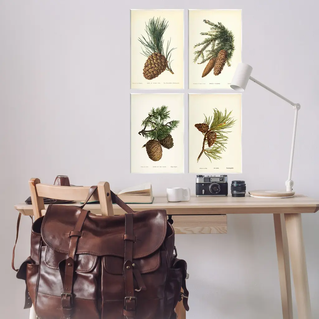 Fill any space with Stupell Wall Art Sets. Our wall plaques start as high-quality lithograph prints mounted on durable 0.5-inch thick MDF wood. Each piece is hand finished and comes with a fresh layer of white foil on the sides to give it a crisp, clean look. Plaques arrive ready to hang without installation and come with removable plastic corners to keep them from damage in transit. Stupell Wall Art is made in the USA.Features: Dimensions: 4 Piece Set, Each Panel is 10 x 0.5 x 15 InchesFour Piece Wall Plaque Sets are available as 10"x15" or 13"x19" Panels. All wall plaques have a 0.5" Depth.Wall Art is Ready to Hang with Hardware Free Hanging. No installation required. For Easy Set Up Lean or Layer Artwork on Shelf or Against Wall.All of our wall plaques start off as high quality lithograph prints that are then mounted on durable 0.5 inch thick MDF wood. Each piece is hand finished and comes with a fresh layer of foil on the sides to give it a crisp clean look. Made In USA.Artwork Relates To: Botanical, Nature, Plant, Tree, Pinecone, Woodland, VintageDesign by Tina Higgins Designs, Inc.