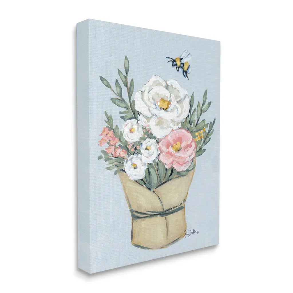 We create our stretched canvas to the highest standards. Using only the highest quality inks and canvas on Mimaki printers, we hand-cut and stretch each piece over a 1.5-inch thick wooden frame for hanging. As a result, the art comes ready to hang on the sturdy ledge with no installation required. Stupell Wall Art is made in the USA.Features: Dimensions: 16 x 1.5 x 20 InchesStretched Canvas Sizes Include Standard: 16 x 1.5 x 20 Large: 20 x 1.5 x 30 X-Large: 30 x 1.5 x 40 Oversized: 36 x 1.5 x 48Wall Art is Ready to Hang with Hardware Free Hanging. No installation required. For Easy Set Up Lean or Layer Artwork on Shelf or Against Wall.Our stretched canvas is created with the highest standards. We use only the highest quality inks and canvas on our in house Mimaki printers, and then hand cut and stretch each piece over a 1.5 inch thick wooden frame for hanging. Made In USA.Artwork Relates To: Painting, Flower, Plant, Rose, Petal, Flower Arrangement, Flower Bouquet, Animal, Bee, Honey Bee, Insect, Invertebrate, Anemone, FloralDesign by Sara Baker