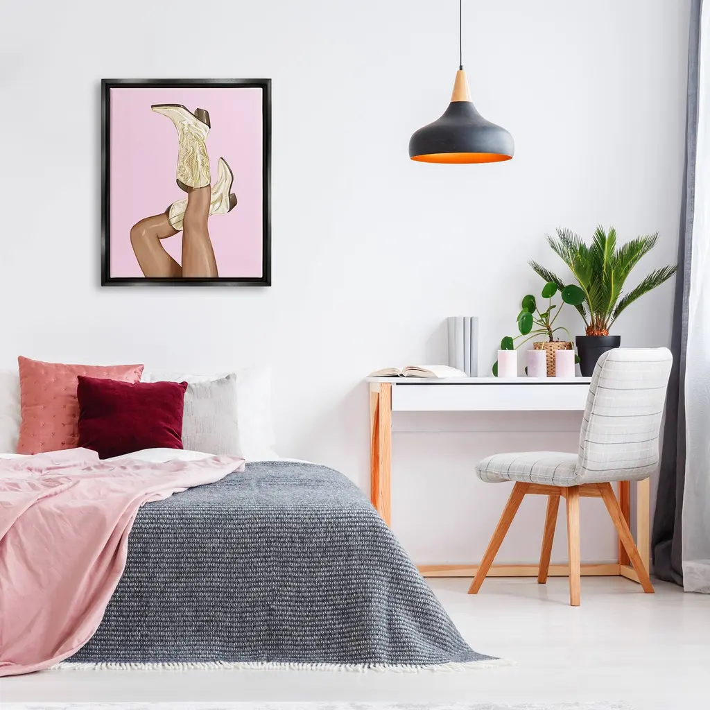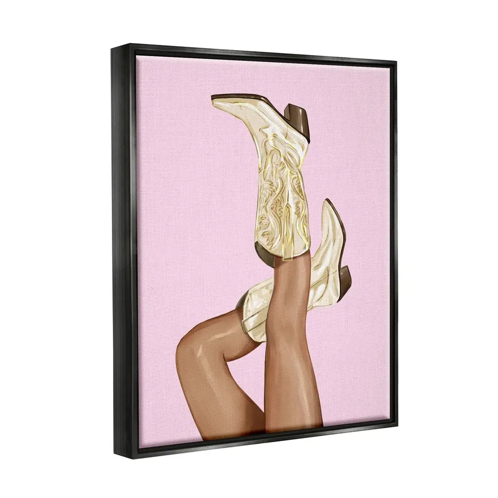 Elevate your home or office to the next level with Stupell Framed Floating Canvas Wall Art. Our premium hand stretched canvas is mounted securly into a sturdy lightweight frame. The museum style gap between wrapped canvas and box frame gives the illusion of floating artwork. Room Type: Living Room, Den, Hallway, Office, Entryway, Study, Dining Room or Bedroom, Guest Room, Studio, Dorm or BoudoirFeatures: Dimensions: 17 x 1.7 x 21 Frame, 16 x 1.5 x 20 Canvas ArtFloating Frame Sizes Include Standard: 17 x 1.7 x 21 Oversized: 25 x 1.7 x 31Wall Art is Ready to Hang - No Installation or Hardware Needed. For Easy Set Up Lean or Layer Artwork on Shelf or Against Wall.Our elevated 1.7" Thick Floating Frame is the perfect complement to our canvas style Wall Art. We use only the highest quality inks in house with industry leading printing solutions. Canvas is hand stretched over a durable wood foundation and then mounted securly into a Modern Box Frame. Made in the USA.Artwork Relates To: Boot, Cowboy Boot, Country, Girl, Cowgirl, PinkDesign by Ziwei Li