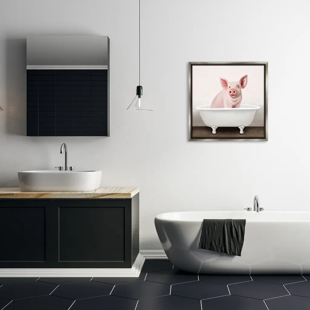Elevate your home or office to the next level with Stupell Framed Floating Canvas Wall Art. Our premium hand-stretched canvas is mounted securely into a sturdy lightweight frame. The museum-style gap between the wrapped canvas and the box frame gives the illusion of floating artwork. Stupell Wall Art is made in the USA.Features: Dimensions: 18 x 1.7 x 18 Frame, 17 x 1.5 x 17 Canvas ArtFloating Frame Canvas Products are available in sizes 18"x18" and 25"x25". All Floating Frame Canvas Products have a 1.7" Depth.Wall Art is Ready to Hang with Hardware Free Hanging. No Installation required. For Easy Set Up Lean or Layer Artwork on Shelf or Against Wall. Artwork is Permently Fixed into the Frame.Our elevated 1.7" Thick Floating Frame is the perfect complement to our canvas style Wall Art. We use only the highest quality inks in house with industry leading printing solutions. Canvas is hand stretched over a durable wood foundation and then mounted securly into a Modern Box Frame. Made in the USA.Artwork Relates To: Bathroom, Tub, Bathtub, Country, Farmhouse, Pig, Vintage, TraditionalDesign by Elizabeth Tyndall