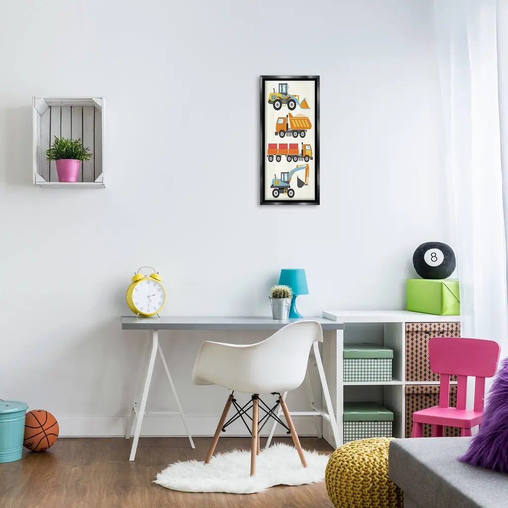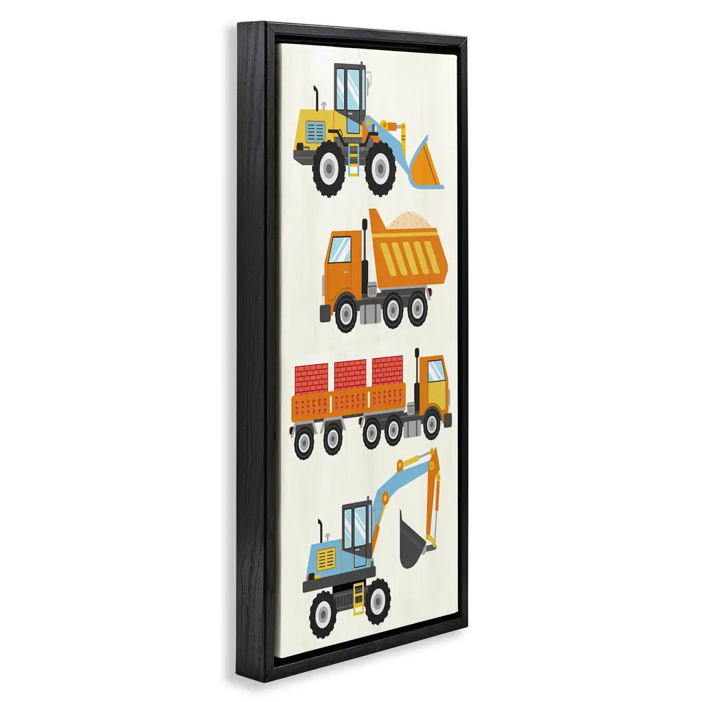 Elevate your home or office to the next level with Stupell Framed Floating Canvas Wall Art. Our premium hand-stretched canvas is mounted securely into a sturdy lightweight frame. The museum-style gap between the wrapped canvas and the box frame gives the illusion of floating artwork. Stupell Wall Art is made in the USA.Features: Dimensions: 11 x 1.7 x 25 Frame, 10 x 1.5 x 24 Canvas ArtFloating Frame Canvas Products are available in sizes 11"x25" and 14"x31". All Floating Frame Canvas Products have a 1.7" Depth.Wall Art is Ready to Hang with Hardware Free Hanging. No Installation required. For Easy Set Up Lean or Layer Artwork on Shelf or Against Wall. Artwork is Permently Fixed into the Frame.Our elevated 1.7" Thick Floating Frame is the perfect complement to our canvas style Wall Art. We use only the highest quality inks in house with industry leading printing solutions. Canvas is hand stretched over a durable wood foundation and then mounted securly into a Modern Box Frame. Made in the USA.Artwork Relates To: Transportation, Trucks, Vehicle, Construction, Kids, Bulldozer, Dump TruckDesign by Kim Allen