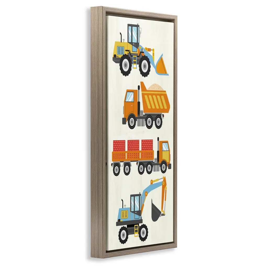 Elevate your home or office to the next level with Stupell Framed Floating Canvas Wall Art. Our premium hand-stretched canvas is mounted securely into a sturdy lightweight frame. The museum-style gap between the wrapped canvas and the box frame gives the illusion of floating artwork. Stupell Wall Art is made in the USA.Features: Dimensions: 11 x 1.7 x 25 Frame, 10 x 1.5 x 24 Canvas ArtFloating Frame Canvas Products are available in sizes 11"x25" and 14"x31". All Floating Frame Canvas Products have a 1.7" Depth.Wall Art is Ready to Hang with Hardware Free Hanging. No Installation required. For Easy Set Up Lean or Layer Artwork on Shelf or Against Wall. Artwork is Permently Fixed into the Frame.Our elevated 1.7" Thick Floating Frame is the perfect complement to our canvas style Wall Art. We use only the highest quality inks in house with industry leading printing solutions. Canvas is hand stretched over a durable wood foundation and then mounted securly into a Modern Box Frame. Made in the USA.Artwork Relates To: Transportation, Trucks, Vehicle, Construction, Kids, Bulldozer, Dump TruckDesign by Kim Allen