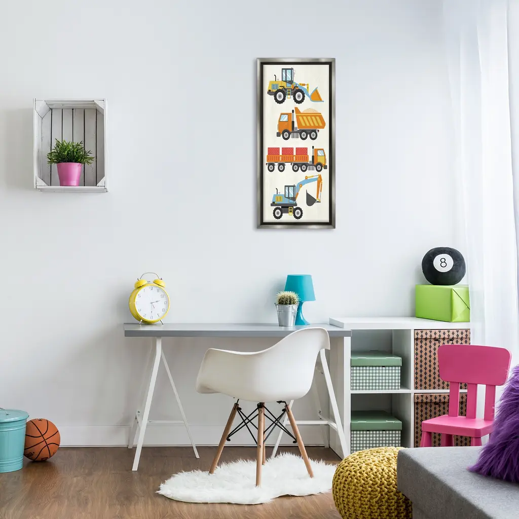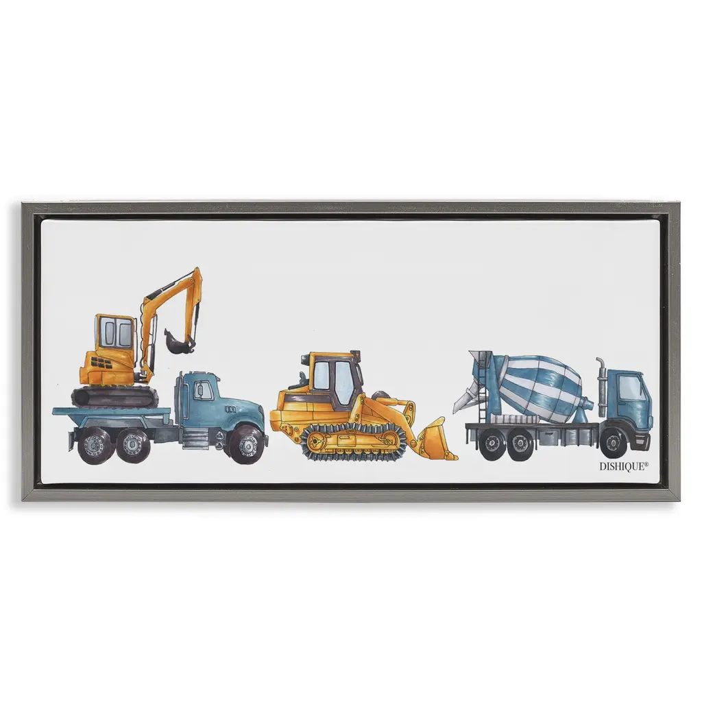 Elevate your home or office to the next level with Stupell Framed Floating Canvas Wall Art. Our premium hand-stretched canvas is mounted securely into a sturdy lightweight frame. The museum-style gap between the wrapped canvas and the box frame gives the illusion of floating artwork. Stupell Wall Art is made in the USA.Features: Dimensions: 11 x 1.7 x 25 Frame, 10 x 1.5 x 24 Canvas ArtFloating Frame Canvas Products are available in sizes 11"x25" and 14"x31". All Floating Frame Canvas Products have a 1.7" Depth.Wall Art is Ready to Hang with Hardware Free Hanging. No Installation required. For Easy Set Up Lean or Layer Artwork on Shelf or Against Wall. Artwork is Permently Fixed into the Frame.Our elevated 1.7" Thick Floating Frame is the perfect complement to our canvas style Wall Art. We use only the highest quality inks in house with industry leading printing solutions. Canvas is hand stretched over a durable wood foundation and then mounted securly into a Modern Box Frame. Made in the USA.Artwork Relates To: Transportation, Trucks, Vehicle, Construction, Kids, Bulldozer, Dump TruckDesign by Kim Allen