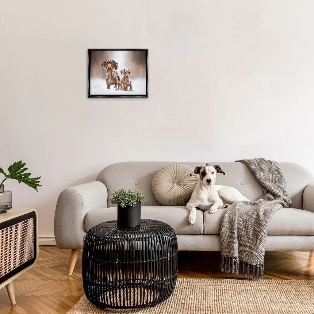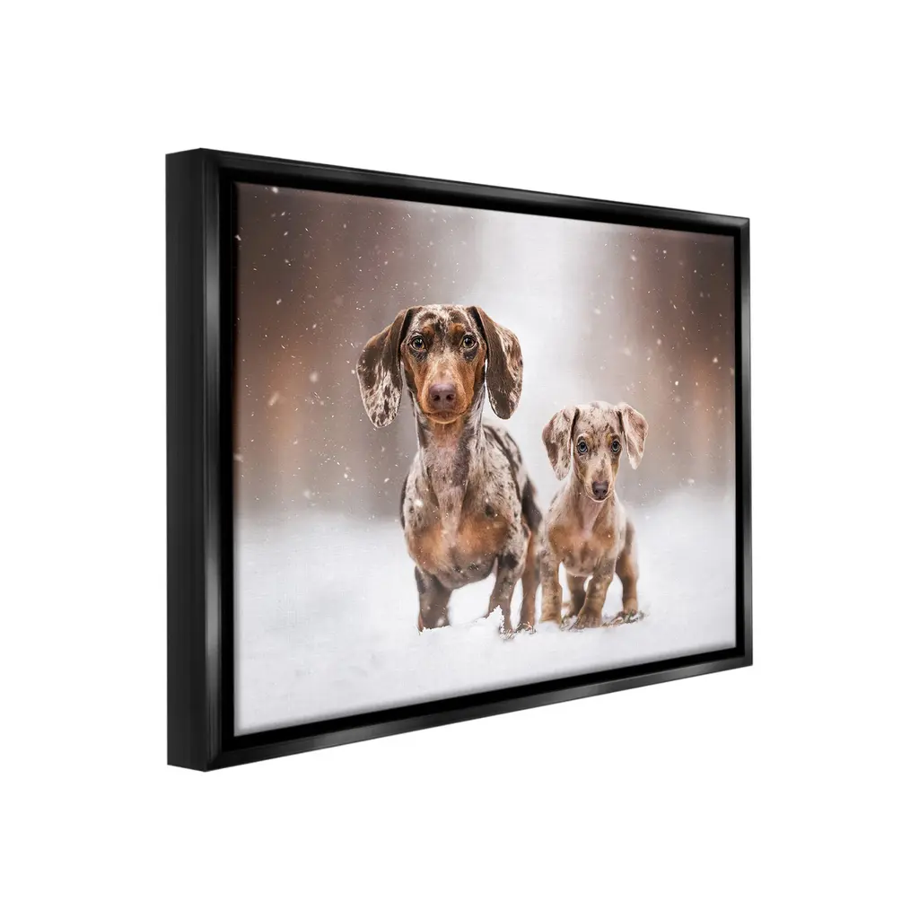 Elevate your home or office to the next level with Stupell Framed Floating Canvas Wall Art. Our premium hand-stretched canvas is mounted securely into a sturdy lightweight frame. The museum-style gap between the wrapped canvas and the box frame gives the illusion of floating artwork. Stupell Wall Art is made in the USA.Features: Dimensions: 21 x 1.7 x 17 Frame, 20 x 1.5 x 16 Canvas ArtFloating Frame Canvas Products are available in sizes 21"x17" and 31"x25". All Floating Frame Canvas Products have a 1.7" Depth.Wall Art is Ready to Hang with Hardware Free Hanging. No Installation required. For Easy Set Up Lean or Layer Artwork on Shelf or Against Wall. Artwork is Permently Fixed into the Frame.Our elevated 1.7" Thick Floating Frame is the perfect complement to our canvas style Wall Art. We use only the highest quality inks in house with industry leading printing solutions. Canvas is hand stretched over a durable wood foundation and then mounted securly into a Modern Box Frame. Made in the USA.Artwork Relates To: Animal, Canine, Mammal, Pet, Dog, Puppy, Snow, Winter, DachshundDesign by Natalie Grosse