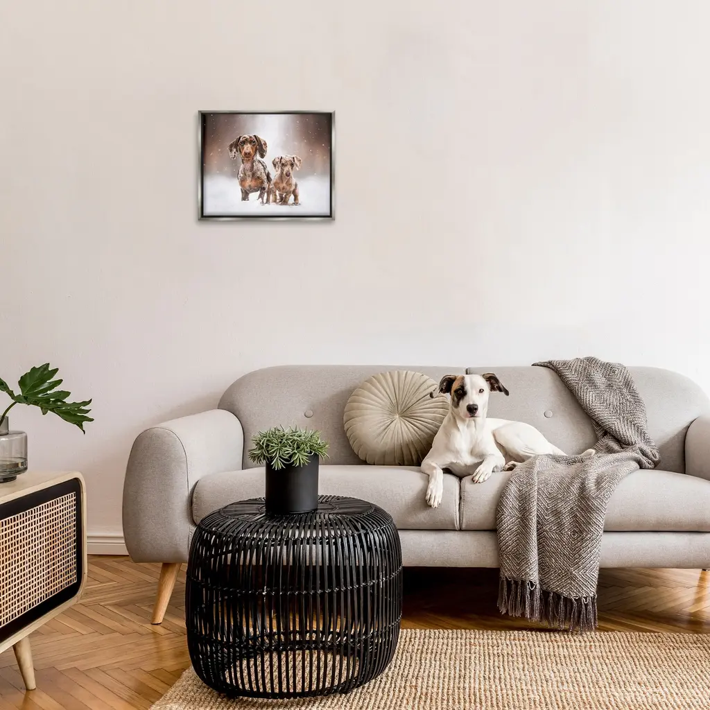 Elevate your home or office to the next level with Stupell Framed Floating Canvas Wall Art. Our premium hand-stretched canvas is mounted securely into a sturdy lightweight frame. The museum-style gap between the wrapped canvas and the box frame gives the illusion of floating artwork. Stupell Wall Art is made in the USA.Features: Dimensions: 21 x 1.7 x 17 Frame, 20 x 1.5 x 16 Canvas ArtFloating Frame Canvas Products are available in sizes 21"x17" and 31"x25". All Floating Frame Canvas Products have a 1.7" Depth.Wall Art is Ready to Hang with Hardware Free Hanging. No Installation required. For Easy Set Up Lean or Layer Artwork on Shelf or Against Wall. Artwork is Permently Fixed into the Frame.Our elevated 1.7" Thick Floating Frame is the perfect complement to our canvas style Wall Art. We use only the highest quality inks in house with industry leading printing solutions. Canvas is hand stretched over a durable wood foundation and then mounted securly into a Modern Box Frame. Made in the USA.Artwork Relates To: Animal, Canine, Mammal, Pet, Dog, Puppy, Snow, Winter, DachshundDesign by Natalie Grosse