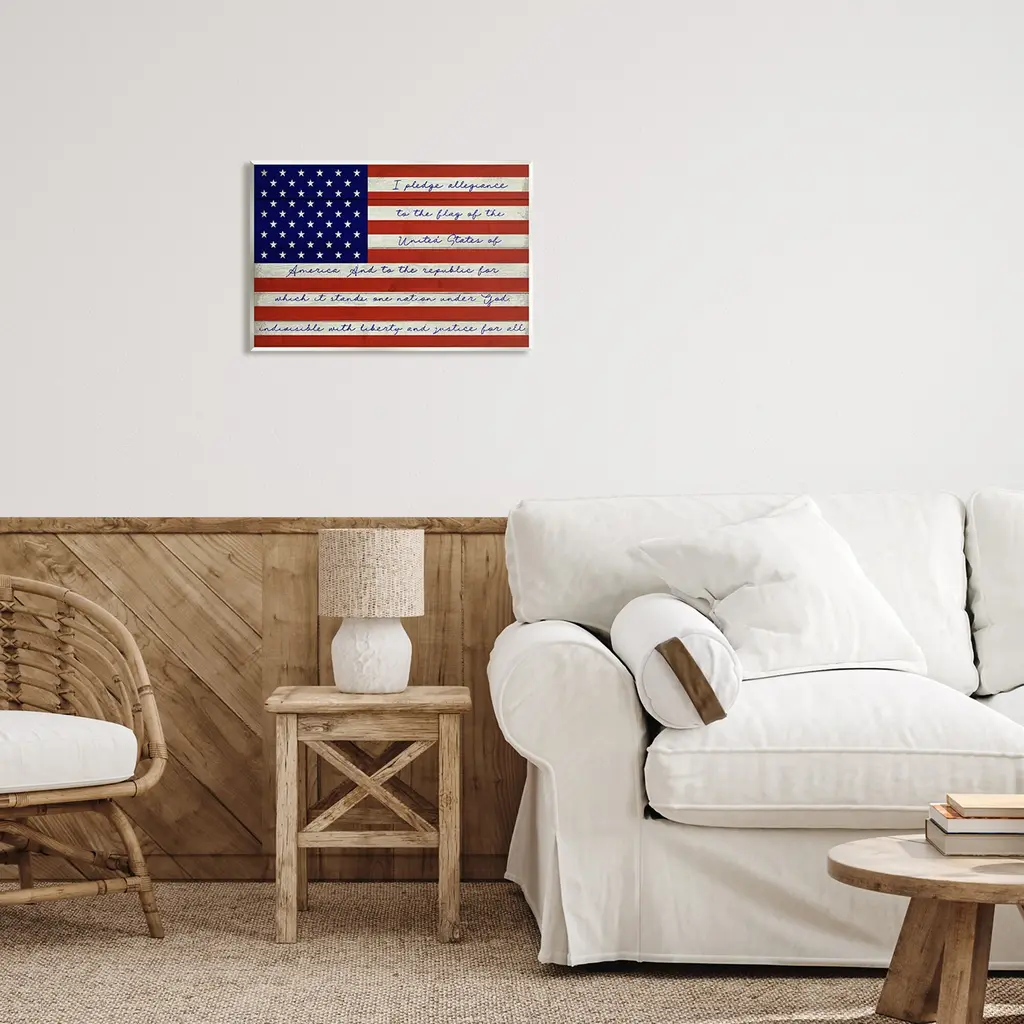 Our wall plaques start as high-quality lithograph prints mounted on durable 0.5-inch thick MDF wood. Each piece is hand finished and comes with a fresh layer of white foil on the sides to give it a crisp, clean look. Plaques arrive ready to hang without installation and come with removable plastic corners to keep them from damage in transit. Stupell Wall Art is made in the USA.Features: Dimensions: 15 x 0.5 x 10 InchesWall Plaque Sizes Include Standard: 15 x 0.5 x 10 Oversized: 19 x 0.5 x 13Wall Art is Ready to Hang with Hardware Free Hanging. No installation required. For Easy Set Up Lean or Layer Artwork on Shelf or Against Wall.All of our wall plaques start off as high quality lithograph prints that are then mounted on durable 0.5 inch thick MDF wood. Each piece is hand finished and comes with a fresh layer of foil on the sides to give it a crisp clean look. Made In USA.Artwork Relates To: American Flag, Flag, I Pledge Allegiance to the Flag of the United States of America And to the Republic for Which it Stands One nation Under God Indivisible with Liberty and Justice For AllDesign by Corinne Haig