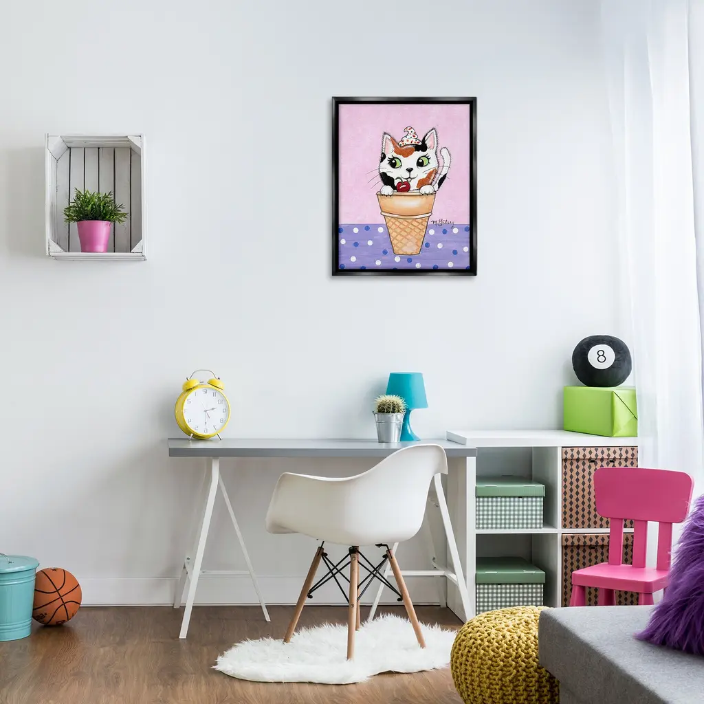 Elevate your home or office to the next level with Stupell Framed Floating Canvas Wall Art. Our premium hand-stretched canvas is mounted securely into a sturdy lightweight frame. The museum-style gap between the wrapped canvas and the box frame gives the illusion of floating artwork. Stupell Wall Art is made in the USA.Features: Dimensions: 17 x 1.7 x 21 Frame, 16 x 1.5 x 20 Canvas ArtFloating Frame Canvas Products are available in sizes 17"x21" and 25"x31". All Floating Frame Canvas Products have a 1.7" Depth.Wall Art is Ready to Hang with Hardware Free Hanging. No Installation required. For Easy Set Up Lean or Layer Artwork on Shelf or Against Wall. Artwork is Permently Fixed into the Frame.Our elevated 1.7" Thick Floating Frame is the perfect complement to our canvas style Wall Art. We use only the highest quality inks in house with industry leading printing solutions. Canvas is hand stretched over a durable wood foundation and then mounted securly into a Modern Box Frame. Made in the USA.Artwork Relates To: Dessert, Food, Ice Cream, Animal, Cat, Mammal, Pet, Sundae, Polka Dot, Pattern, KittenDesign by Michelle Gilsey