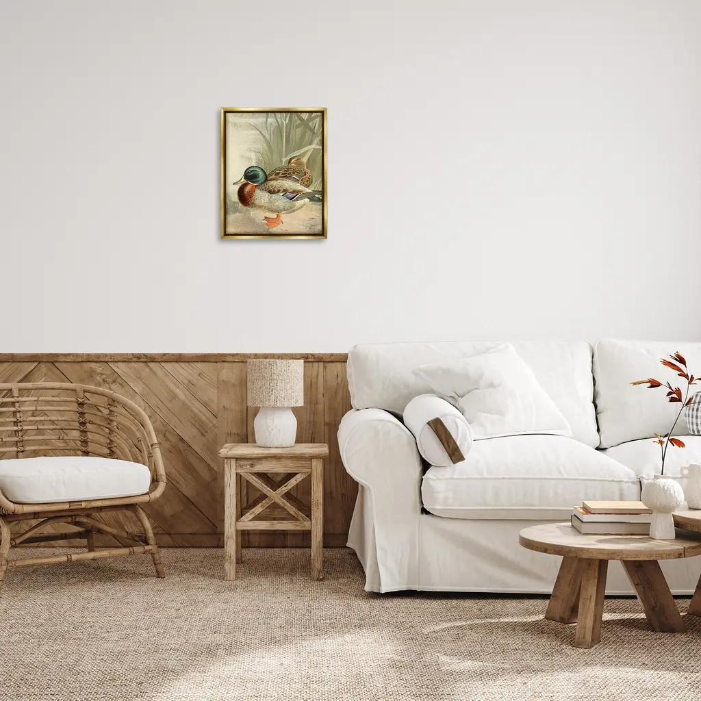 Elevate your home or office to the next level with Stupell Framed Floating Canvas Wall Art. Our premium hand-stretched canvas is mounted securely into a sturdy lightweight frame. The museum-style gap between the wrapped canvas and the box frame gives the illusion of floating artwork. Stupell Wall Art is made in the USA.Features: Dimensions: 17 x 1.7 x 21 Frame, 16 x 1.5 x 20 Canvas ArtFloating Frame Canvas Products are available in sizes 17"x21" and 25"x31". All Floating Frame Canvas Products have a 1.7" Depth.Wall Art is Ready to Hang with Hardware Free Hanging. No Installation required. For Easy Set Up Lean or Layer Artwork on Shelf or Against Wall. Artwork is Permently Fixed into the Frame.Our elevated 1.7" Thick Floating Frame is the perfect complement to our canvas style Wall Art. We use only the highest quality inks in house with industry leading printing solutions. Canvas is hand stretched over a durable wood foundation and then mounted securly into a Modern Box Frame. Made in the USA.Artwork Relates To: Animal, Bird, Duck, Mallard, Beak, Lake, Pond, Landscape, NatureDesign by Gail Fraser
