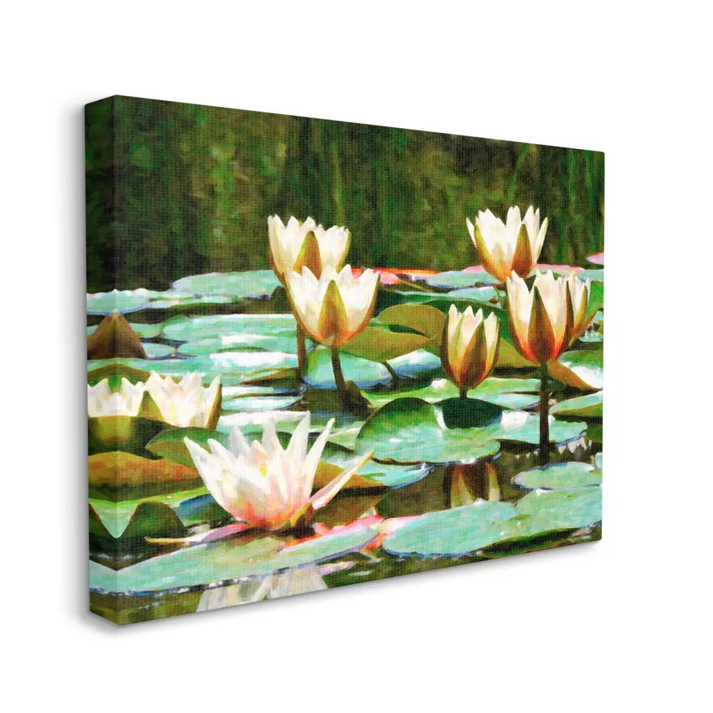 We create our stretched canvas to the highest standards. Using only the highest quality inks and canvas on Mimaki printers, we hand-cut and stretch each piece over a 1.5-inch thick wooden frame for hanging. As a result, the art comes ready to hang on the sturdy ledge with no installation required. Stupell Wall Art is made in the USA.Features: Dimensions: 20 x 1.5 x 16 InchesStretched Canvas Sizes Include Standard: 20 x 1.5 x 16 Large: 30 x 1.5 x 20 X-Large: 40 x 1.5 x 30 Oversized: 48 x 1.5 x 36Wall Art is Ready to Hang with Hardware Free Hanging. No installation required. For Easy Set Up Lean or Layer Artwork on Shelf or Against Wall.Our stretched canvas is created with the highest standards. We use only the highest quality inks and canvas on our in house Mimaki printers, and then hand cut and stretch each piece over a 1.5 inch thick wooden frame for hanging. Made In USA.Artwork Relates To: Flower, Plant, Nature, Pond, Water, Lily, Pond Lily, Petal, LotusDesign by Graffi*Tee Studios
