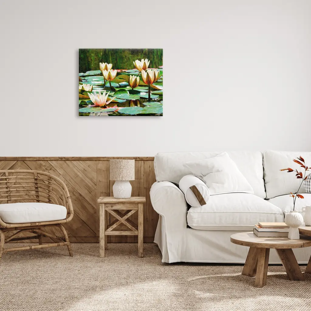 We create our stretched canvas to the highest standards. Using only the highest quality inks and canvas on Mimaki printers, we hand-cut and stretch each piece over a 1.5-inch thick wooden frame for hanging. As a result, the art comes ready to hang on the sturdy ledge with no installation required. Stupell Wall Art is made in the USA.Features: Dimensions: 20 x 1.5 x 16 InchesStretched Canvas Sizes Include Standard: 20 x 1.5 x 16 Large: 30 x 1.5 x 20 X-Large: 40 x 1.5 x 30 Oversized: 48 x 1.5 x 36Wall Art is Ready to Hang with Hardware Free Hanging. No installation required. For Easy Set Up Lean or Layer Artwork on Shelf or Against Wall.Our stretched canvas is created with the highest standards. We use only the highest quality inks and canvas on our in house Mimaki printers, and then hand cut and stretch each piece over a 1.5 inch thick wooden frame for hanging. Made In USA.Artwork Relates To: Flower, Plant, Nature, Pond, Water, Lily, Pond Lily, Petal, LotusDesign by Graffi*Tee Studios