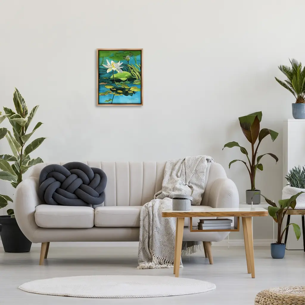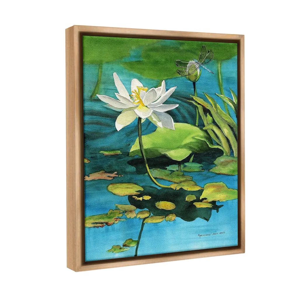 Elevate your home or office to the next level with Stupell Framed Floating Canvas Wall Art. Our premium hand-stretched canvas is mounted securely into a sturdy lightweight frame. The museum-style gap between the wrapped canvas and the box frame gives the illusion of floating artwork. Stupell Wall Art is made in the USA.Features: Dimensions: 17 x 1.7 x 21 Frame, 16 x 1.5 x 20 Canvas ArtFloating Frame Canvas Products are available in sizes 17"x21" and 25"x31". All Floating Frame Canvas Products have a 1.7" Depth.Wall Art is Ready to Hang with Hardware Free Hanging. No Installation required. For Easy Set Up Lean or Layer Artwork on Shelf or Against Wall. Artwork is Permently Fixed into the Frame.Our elevated 1.7" Thick Floating Frame is the perfect complement to our canvas style Wall Art. We use only the highest quality inks in house with industry leading printing solutions. Canvas is hand stretched over a durable wood foundation and then mounted securly into a Modern Box Frame. Made in the USA.Artwork Relates To: Flower, Plant, Lily, Pond Lily, Nature, Pond, Water, Petal, Lotus, Dragonfly, Lily PadDesign by Christine Reichow